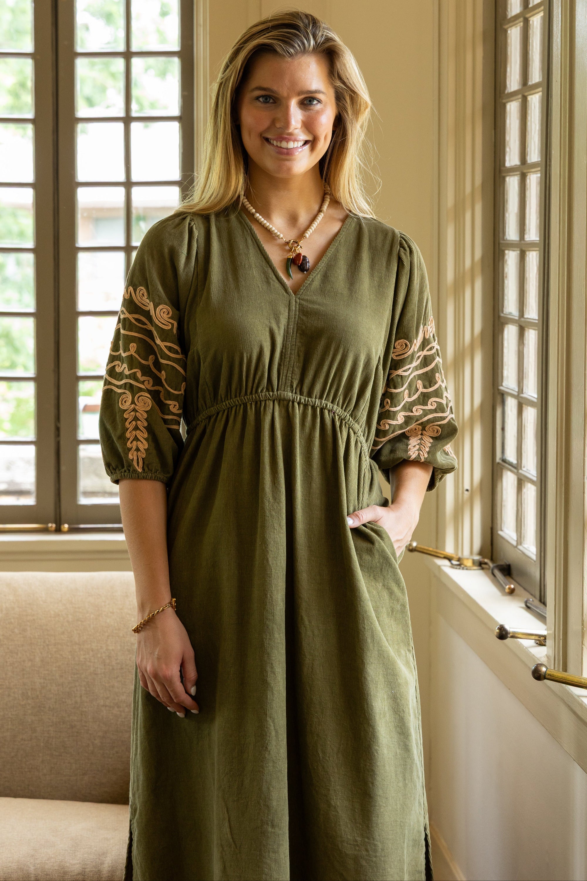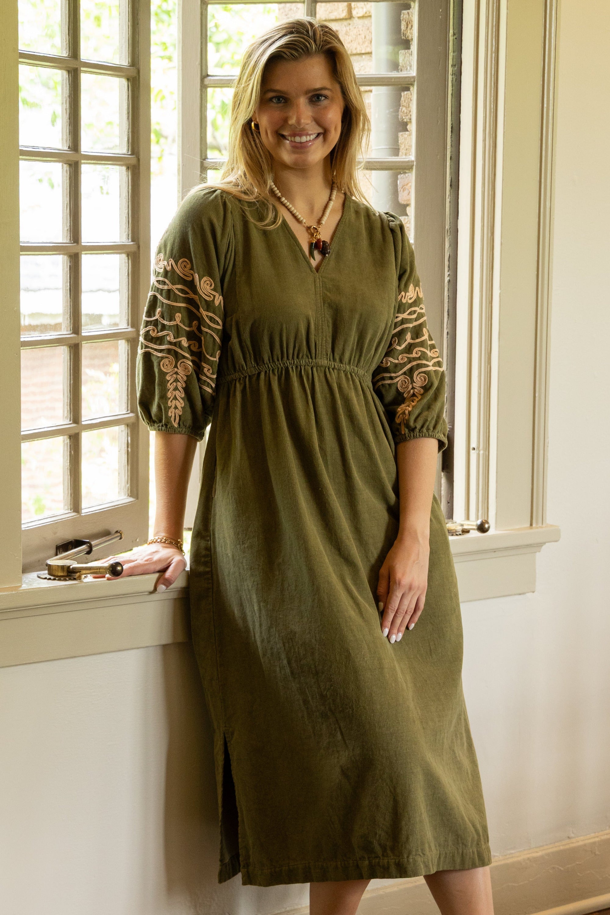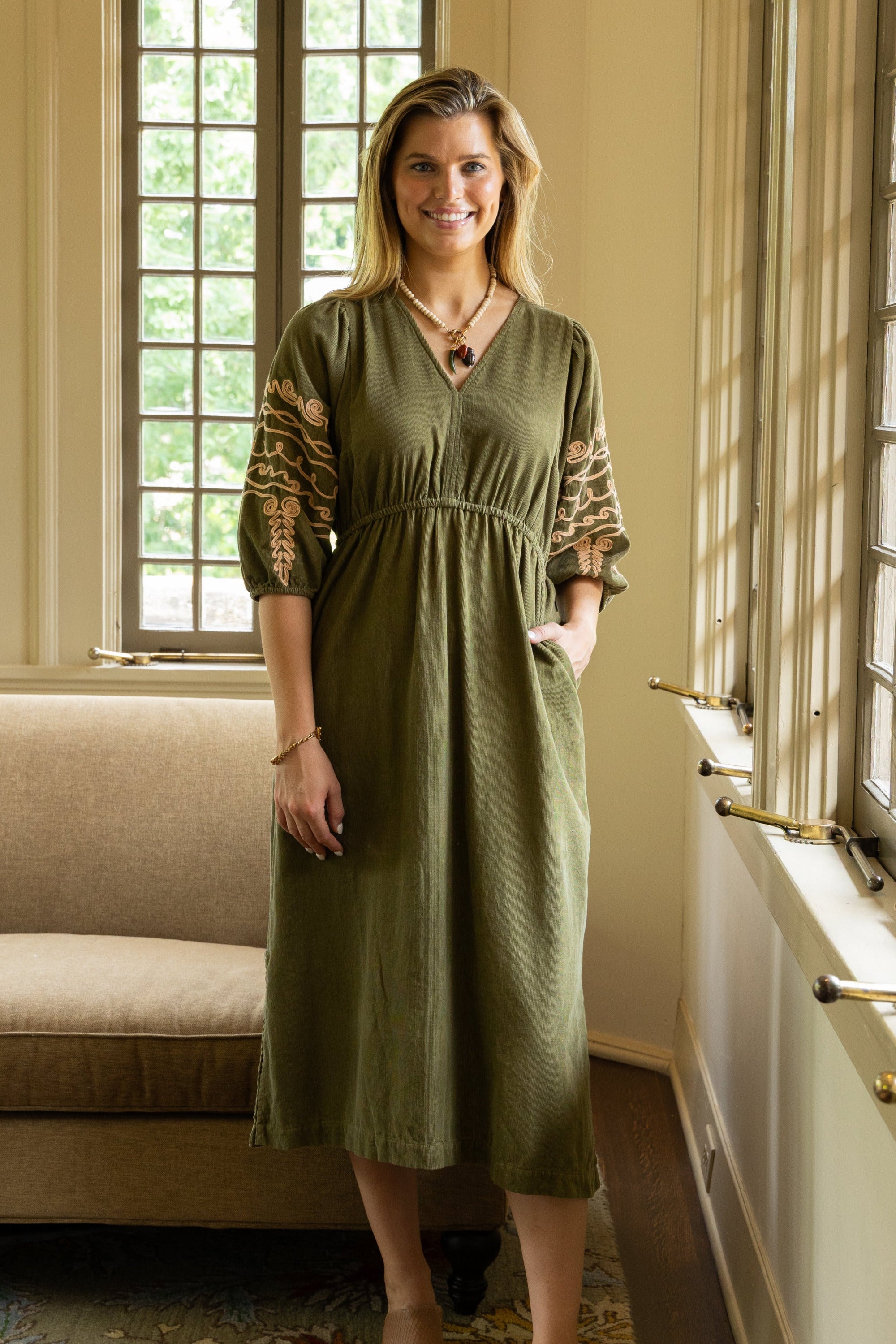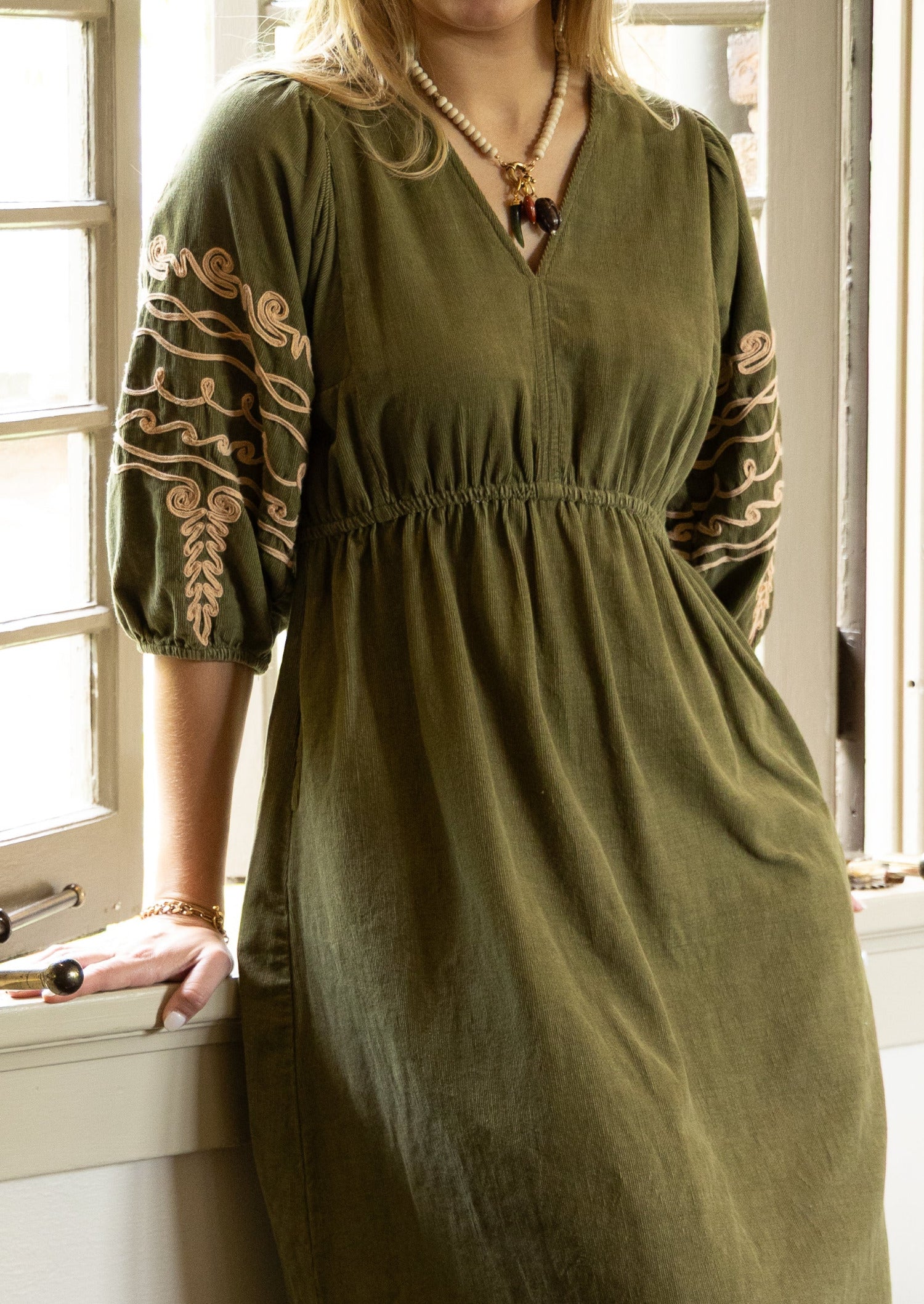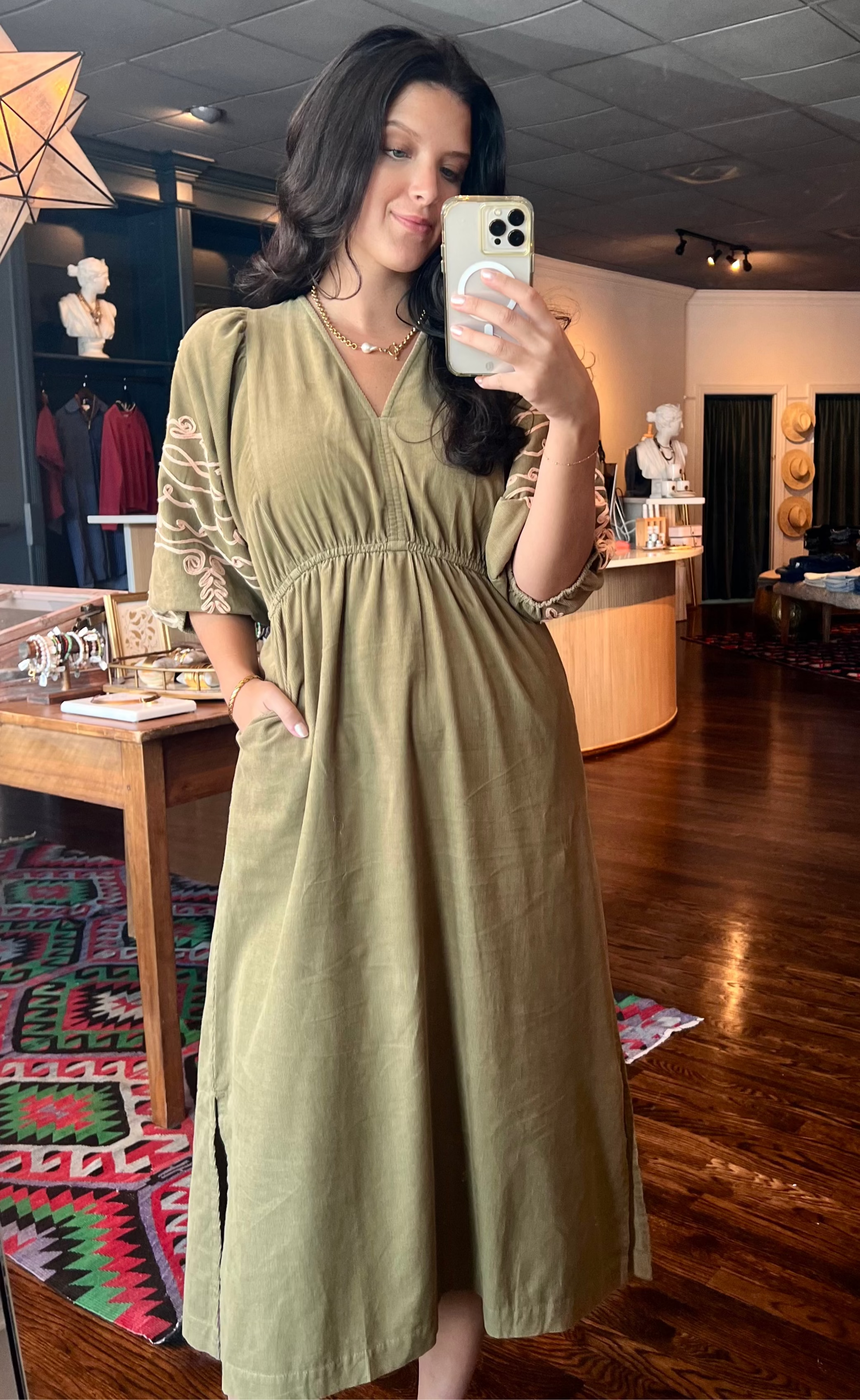 Phoebe Midi Dress in Moss Corduroy by ExVoto