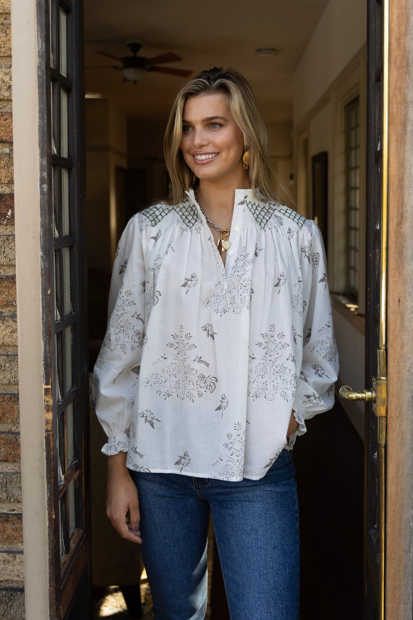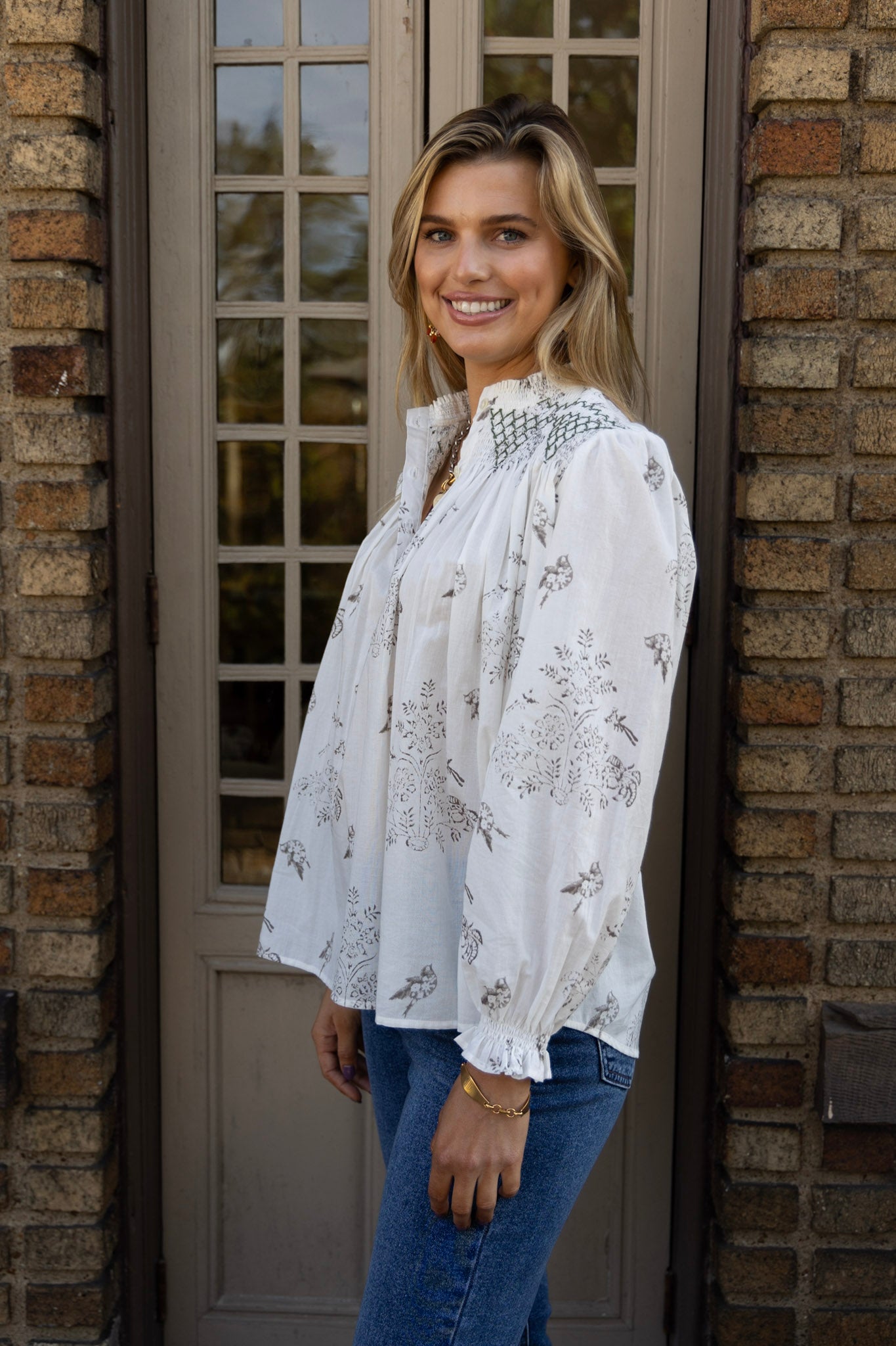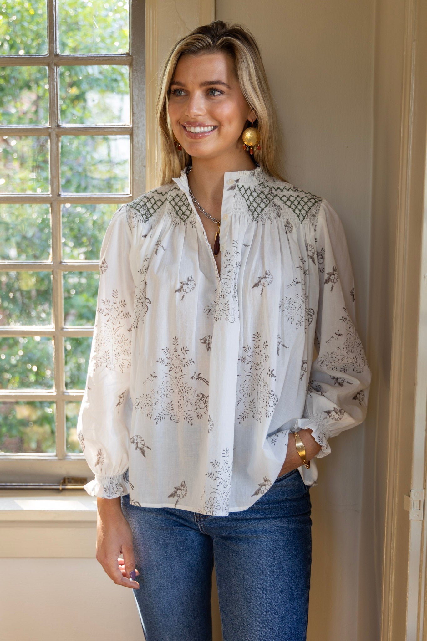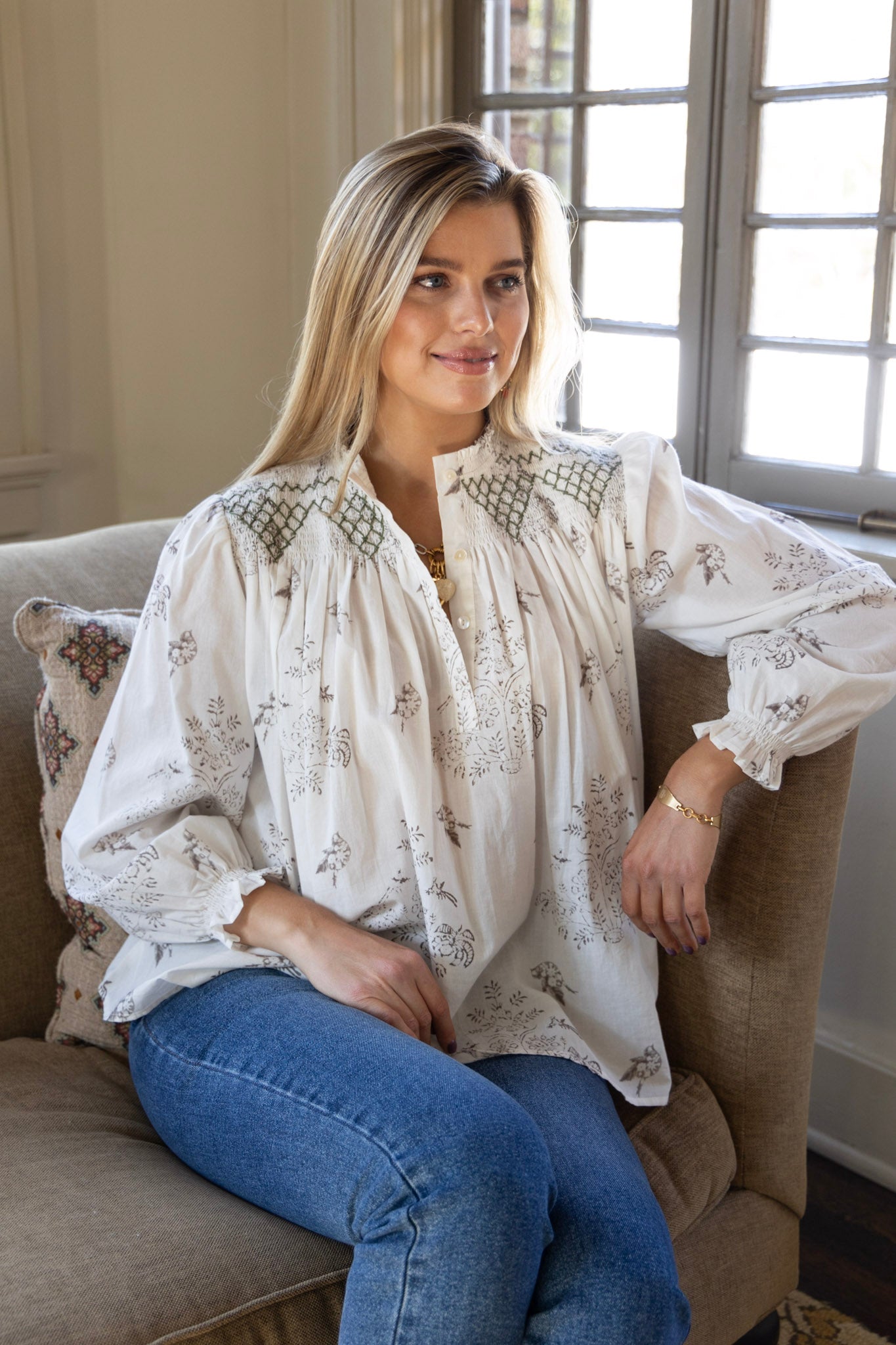 Eve Embroidered Blouse in White with Brown Blockprint by ExVoto
