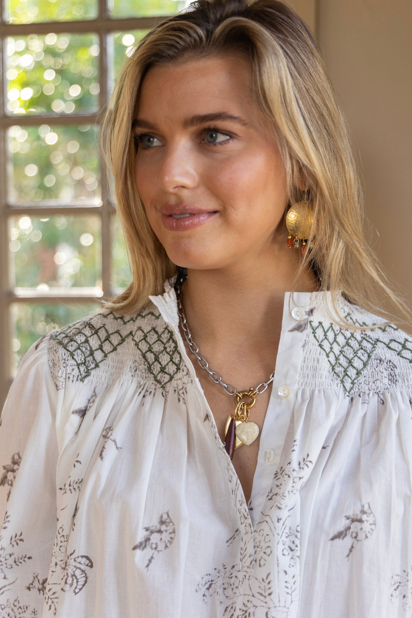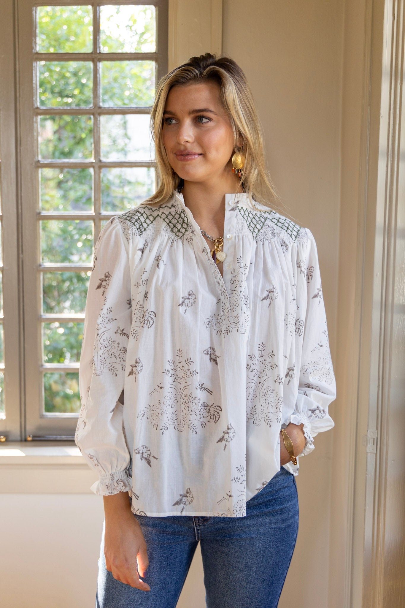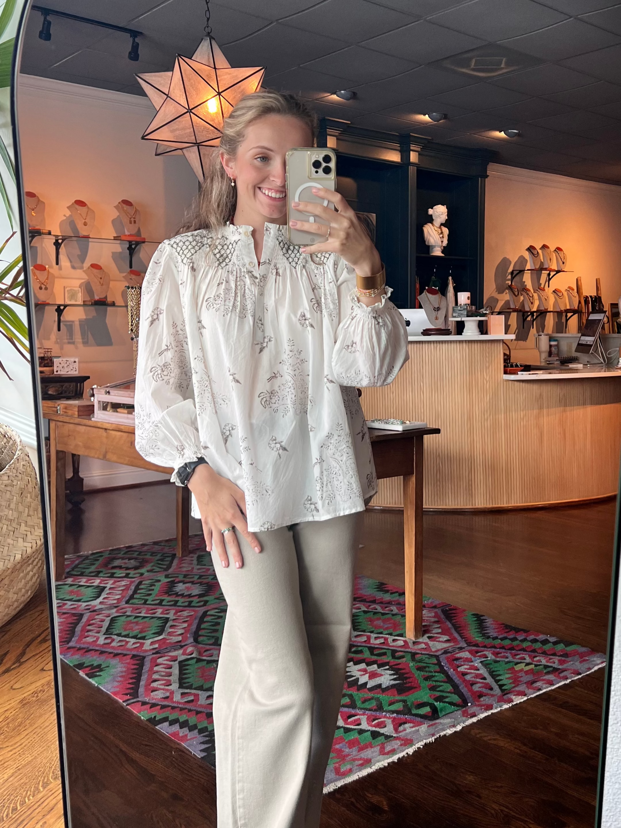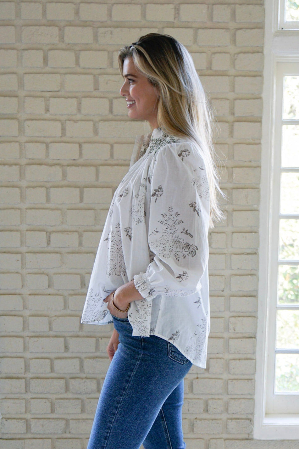 Eve Embroidered Blouse in White with Brown Blockprint by ExVoto