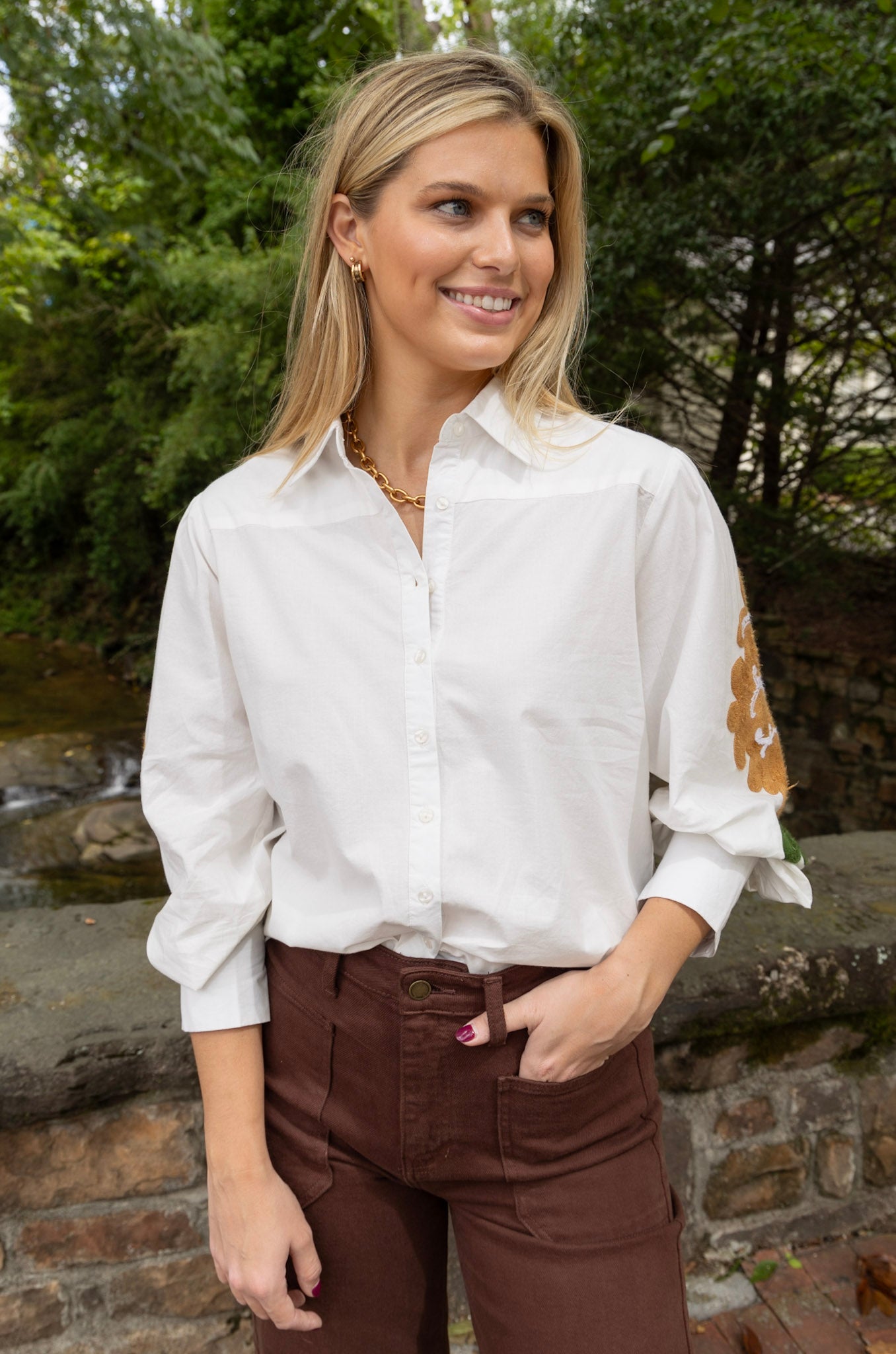 Eve Embroidered Blouse in White with Brown Blockprint by ExVoto
