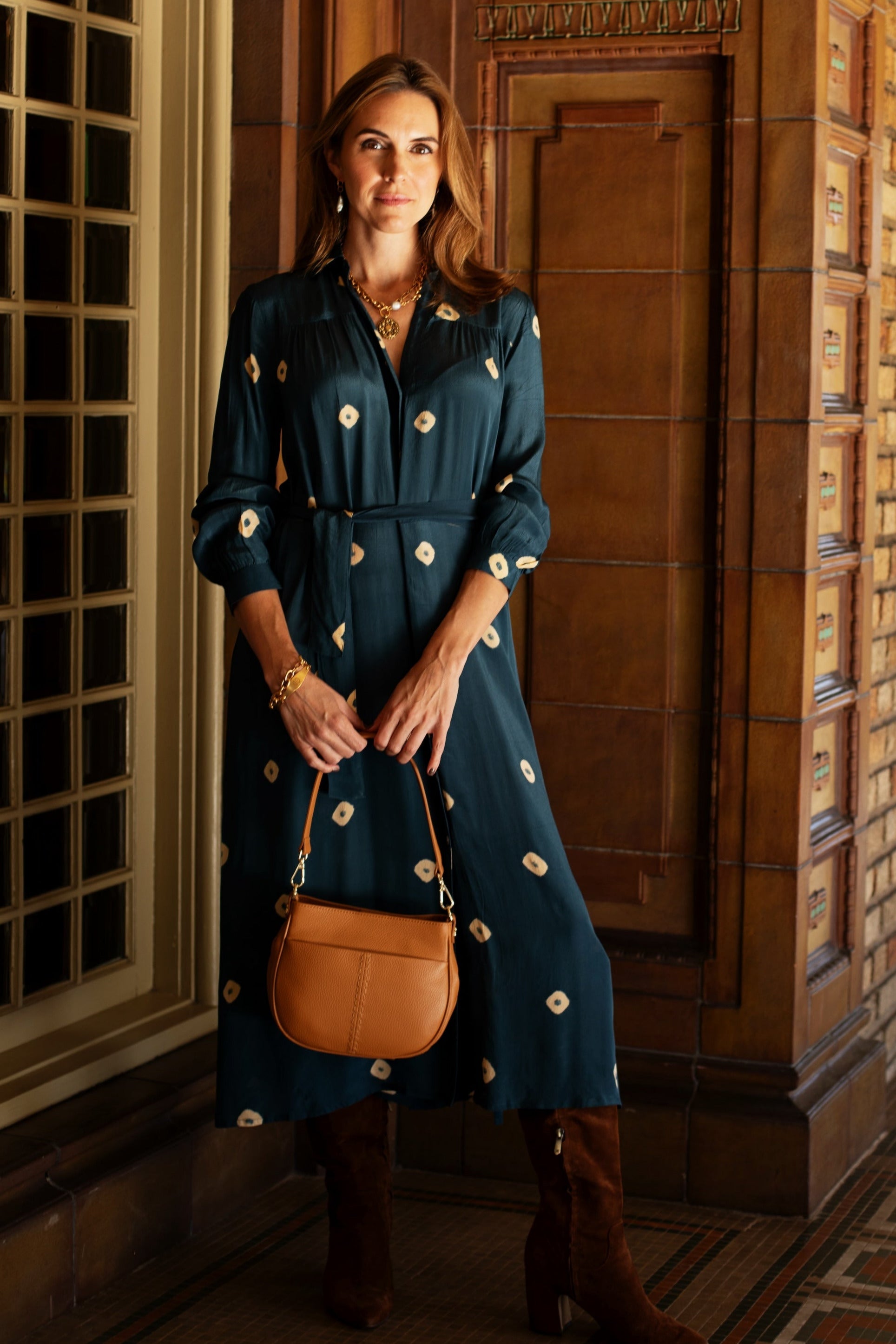 STYLE TIP: The Ari Blouse is now available as a Midi Dress! Made from soft, elegant cupro crepe fabric, this dress features a flattering shape in a lovely steel blue shade that pairs well with black or brown. It includes a removable tie sash belt to highlight the waist.