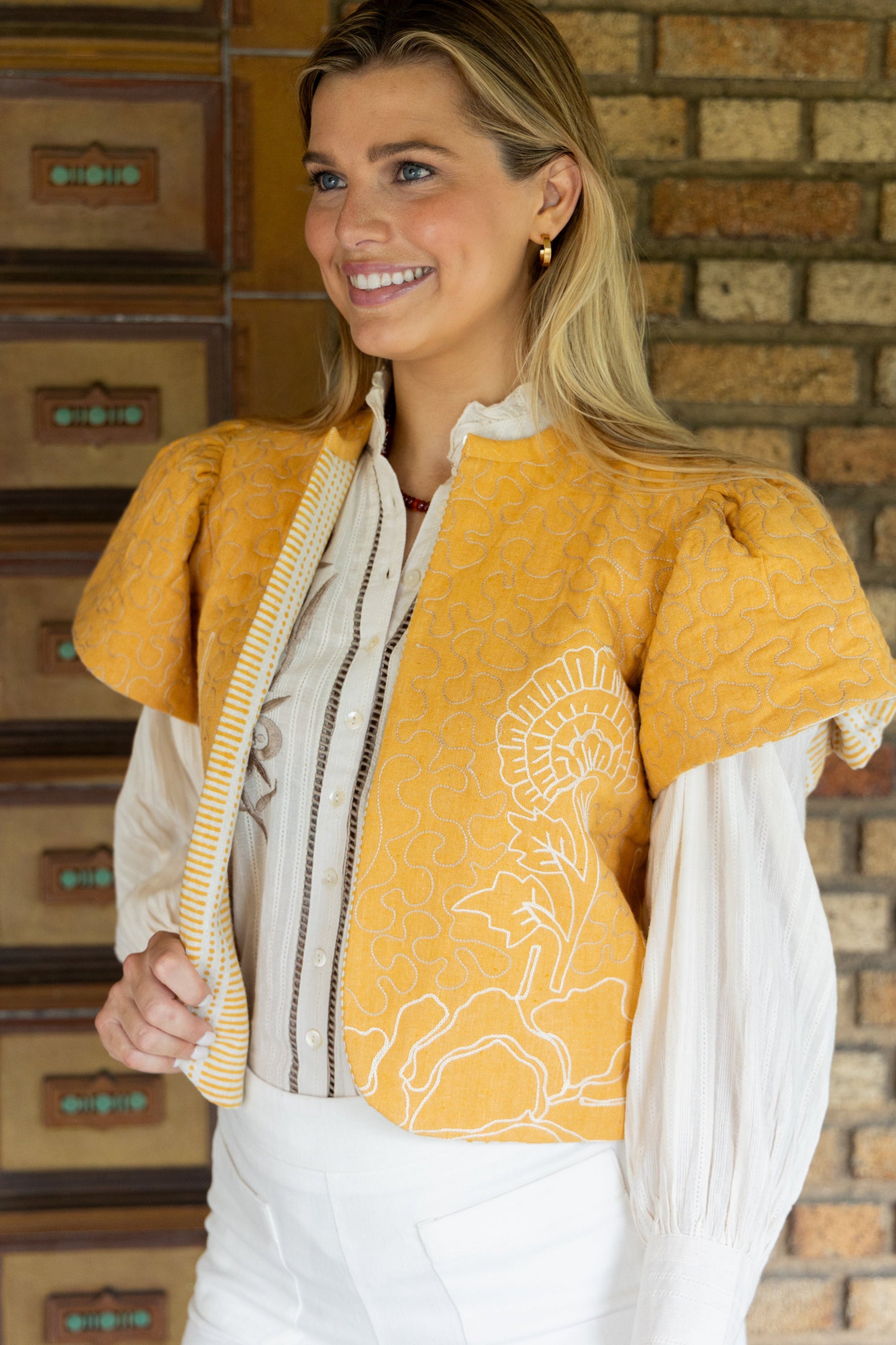 STYLE TIP: Discover the Darby vest, a fun versatile layering piece for your wardrobe. This vest is inspired by a vintage piece discovered by our Designer Elizabeth Adams. Crafted from soft amber yellow cotton, it has two styles: one side with embroidered flowers and the other with a handblock print of lines and dots. It includes flutter sleeves and reaches hip length, perfect for layering over a tank or long sleeve. This vest easily moves from fall to spring and summer wear, style it your own way!