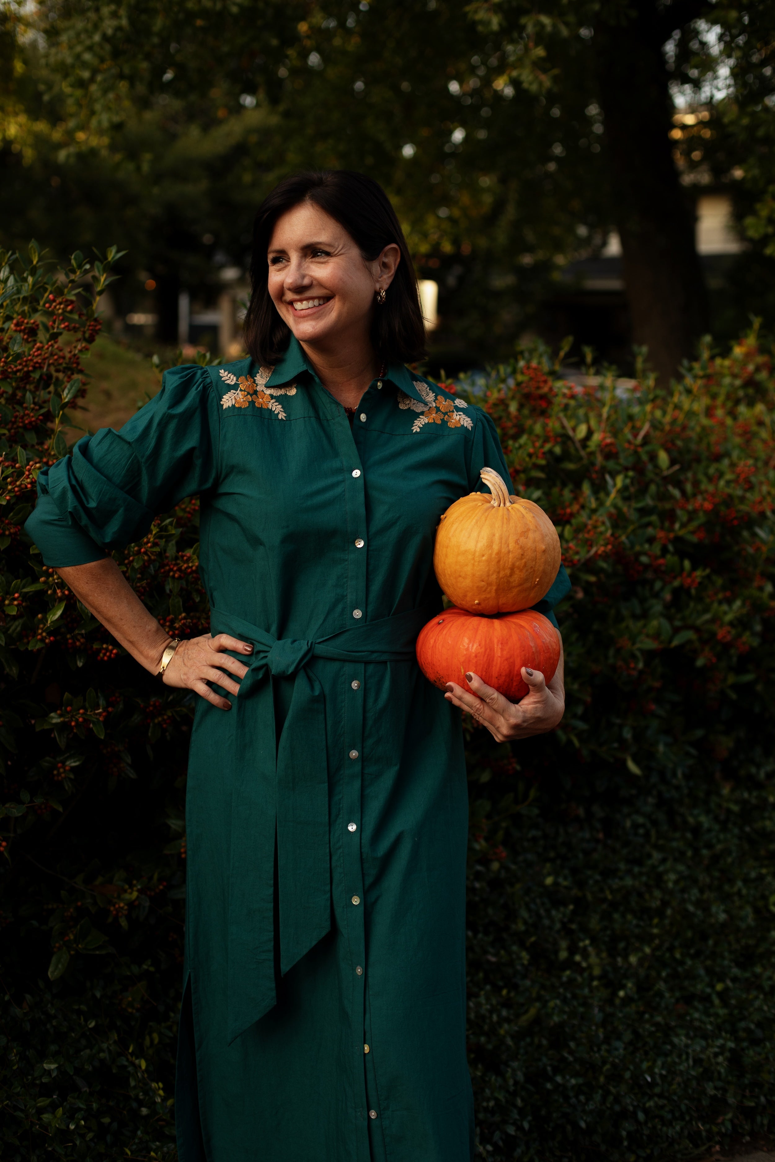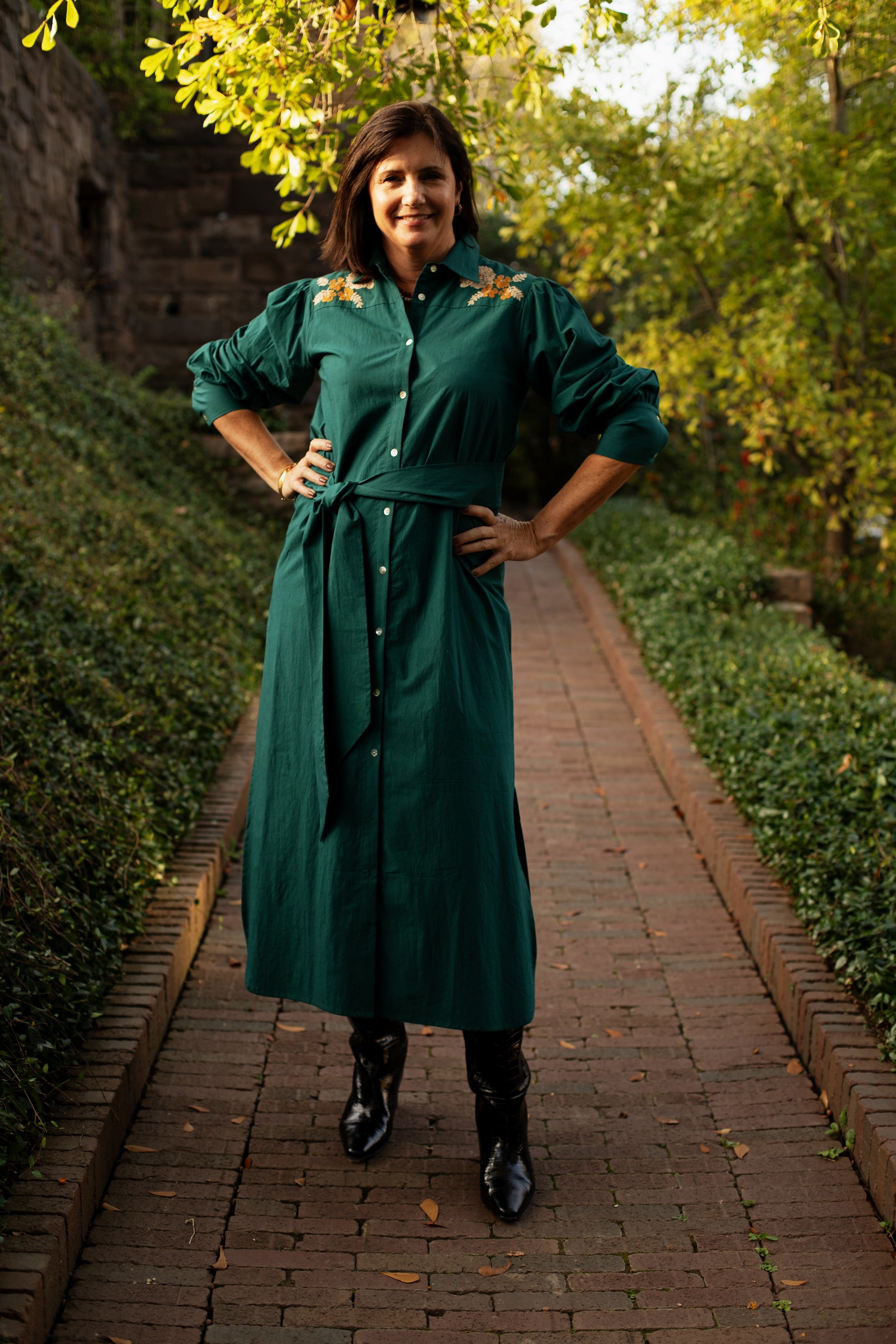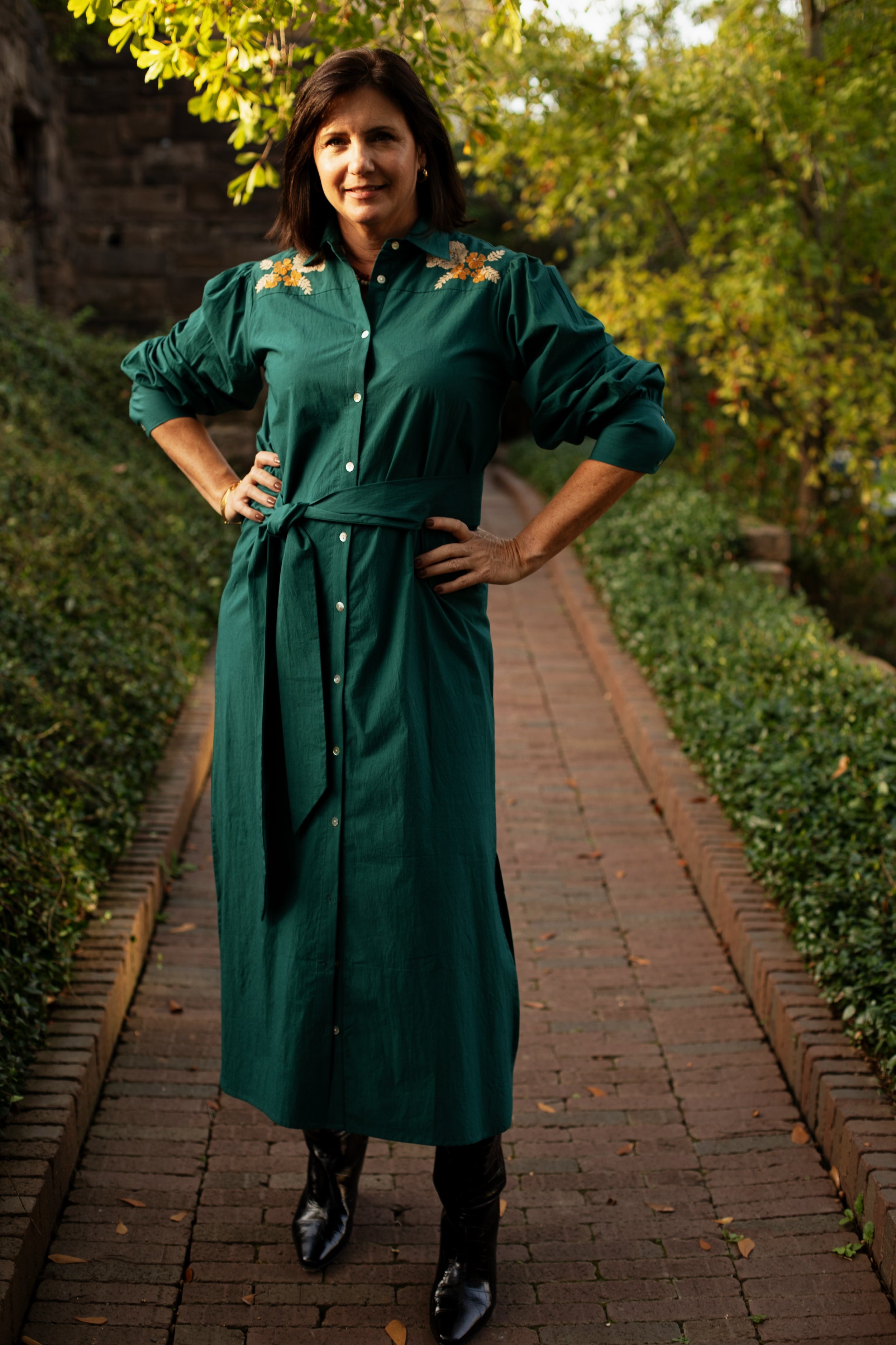 STYLE TIP: The Layla Maxi Dress in Mallard Green from ExVoto is a timeless maxi shirtdress featuring embroidered accents on shoulder and back yoke. It includes a side slit up to the knee for ease of movement and a removable tie sash for versatile styling.