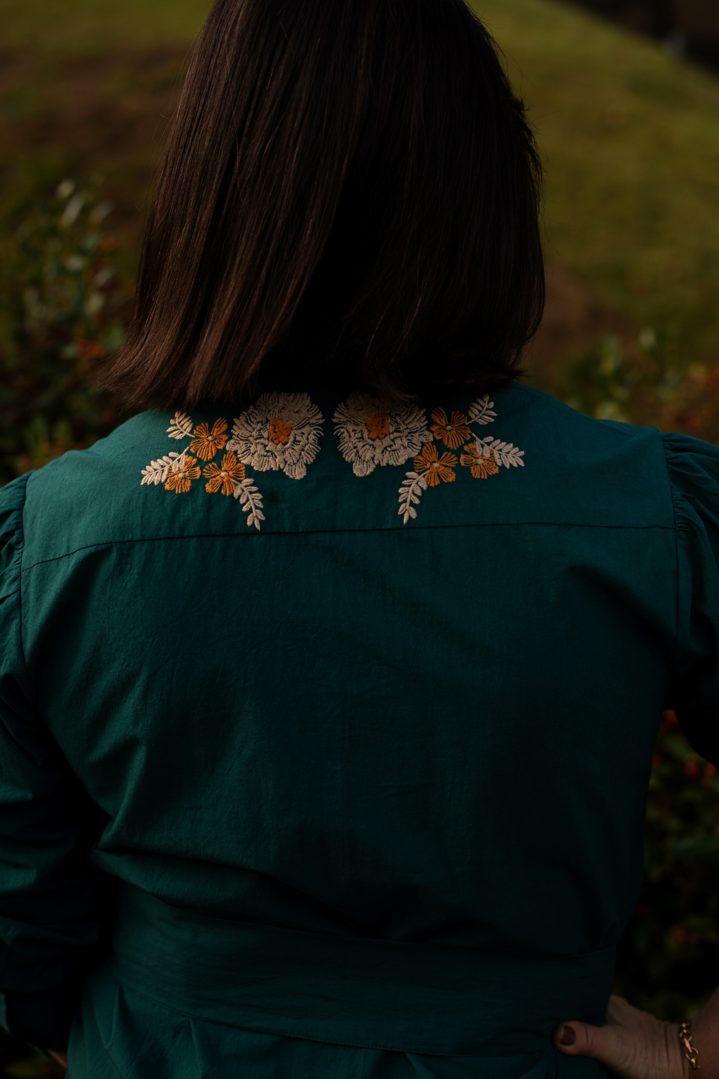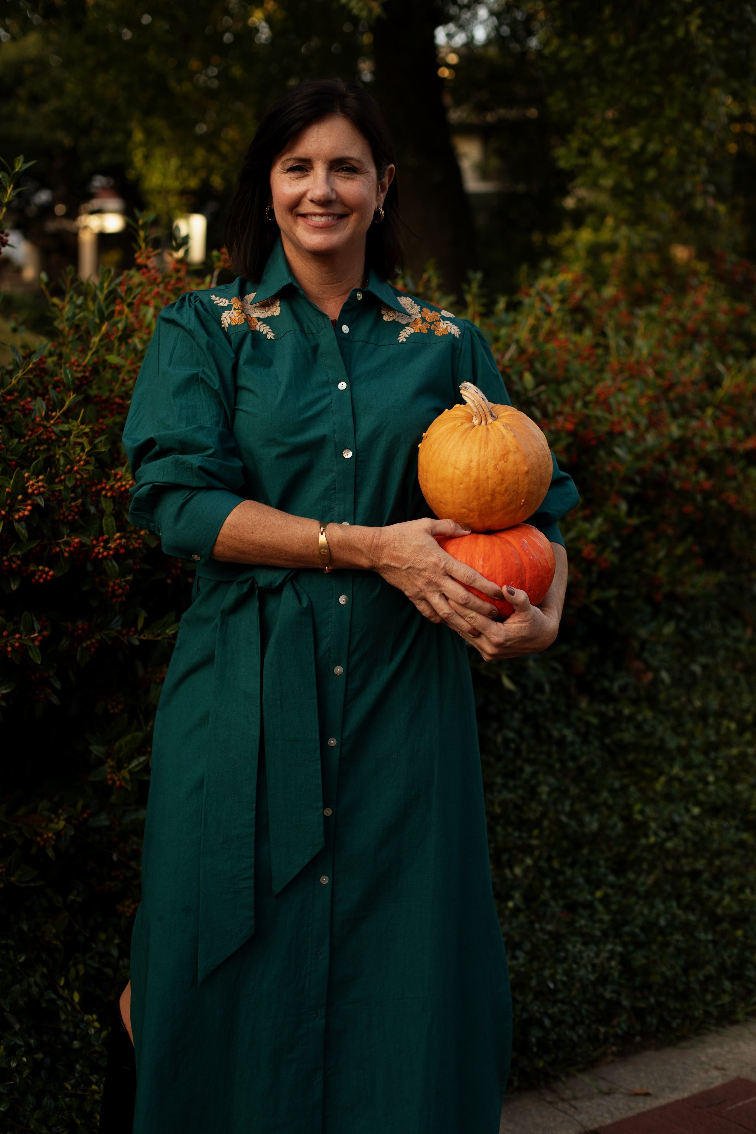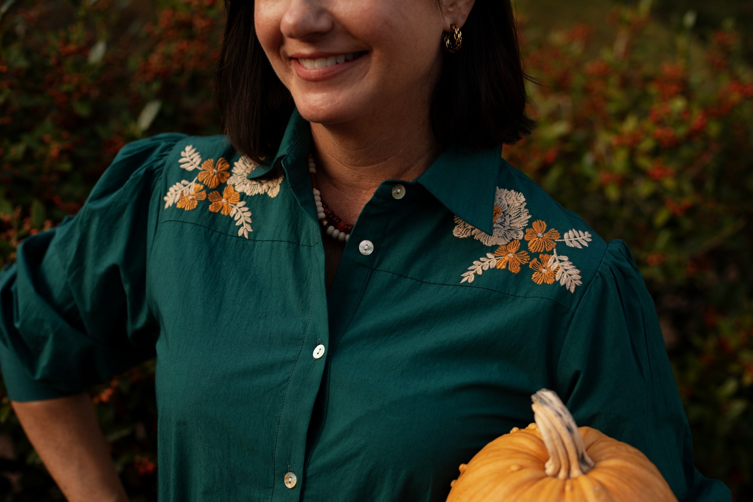 STYLE TIP: The Layla Maxi Dress in Mallard Green from ExVoto is a timeless maxi shirtdress featuring embroidered accents on shoulder and back yoke. It includes a side slit up to the knee for ease of movement and a removable tie sash for versatile styling.