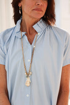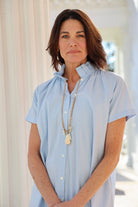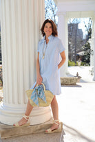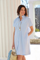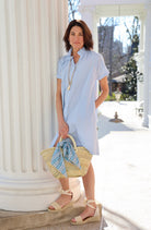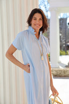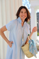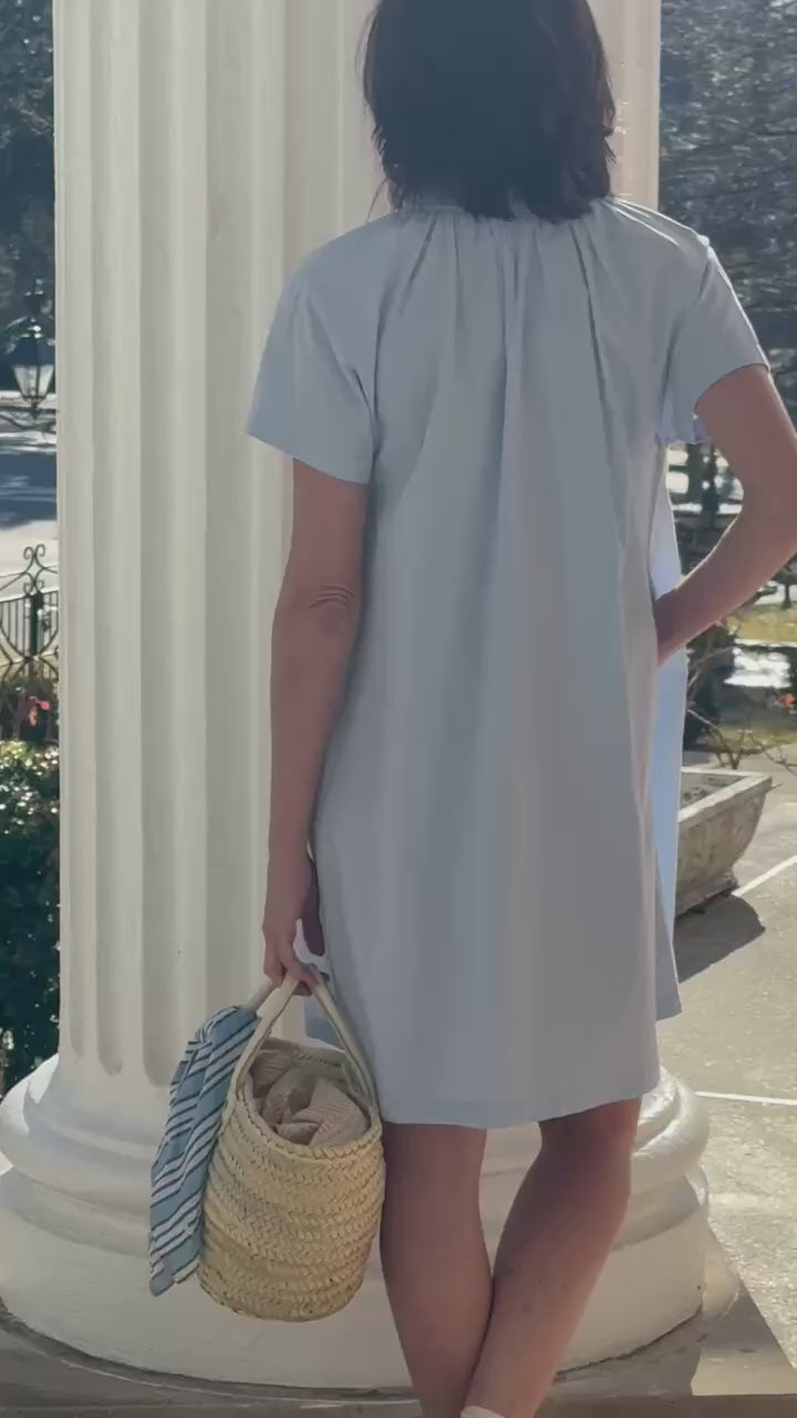 STYLE TIP: The Sarah Dress in Clear Sky by ExVoto features a short-sleeve design, pockets, and a playful flouncy collar that adds just the right amount of flare. Its ideal length hits just above the knee and the soft blue hue is universally flattering.