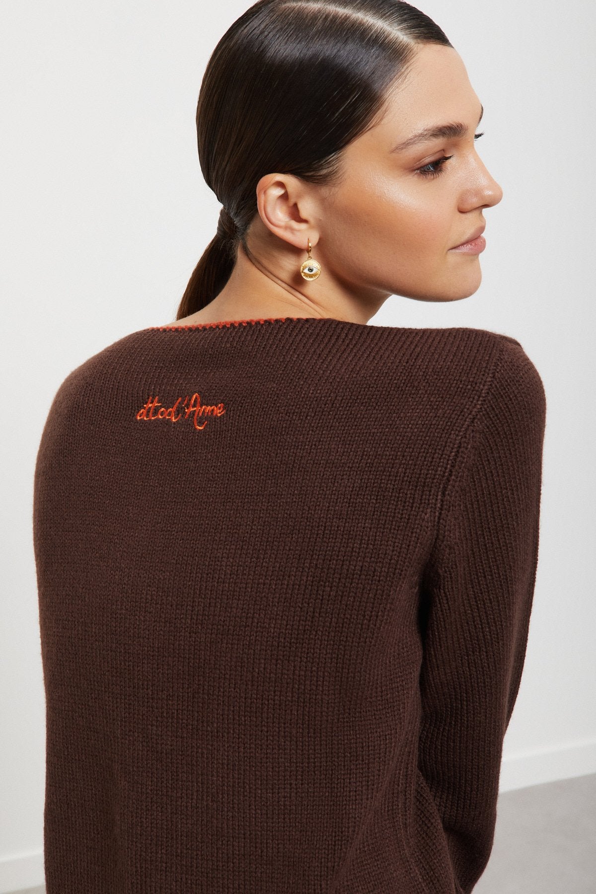 This brown wool blend cardigan features a button front, red piping accents, and the Ottod'Ame logo on the back of the neck. Button front detail to wear unbuttoned or buttoned.