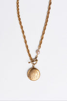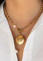 • 18" necklace features plated 18k gold chain with a protective matte finish, a natural freshwater pearl, and our exclusive ExVoto Vintage toggle closure at front.