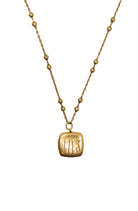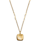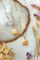 - 18" necklace featuring a gold chain with a protective matte finish and your choice of plain gold chain or with fresh water pearls and a square locket.