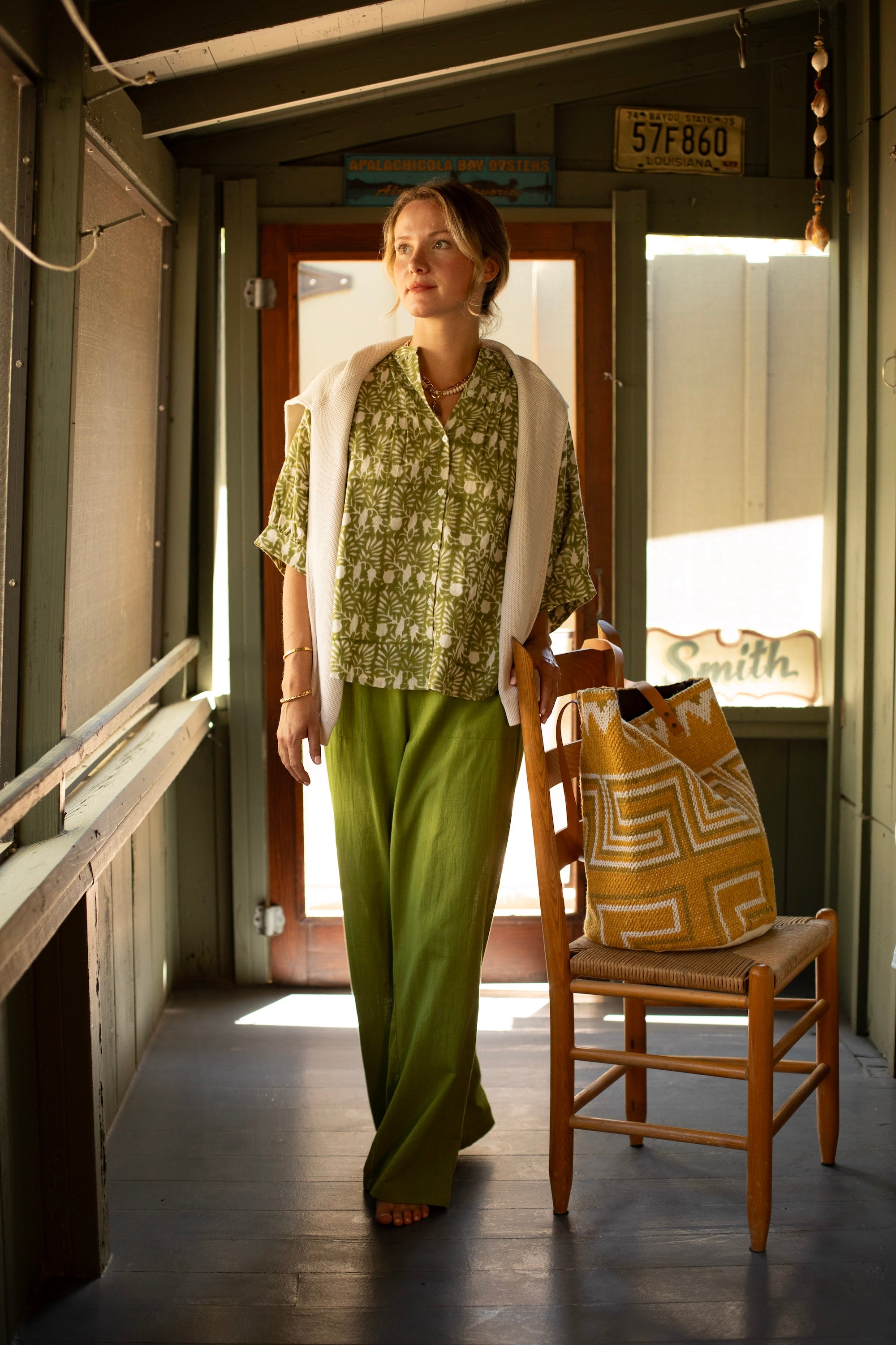 Rosie Cotton Gauze Cropped Beach Pant in Turf Green by ExVoto