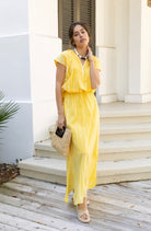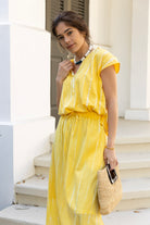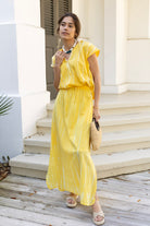 STYLE TIP: Comfortable and versatile, this maxi skirt features a yellow and white tie dye pattern with an elastic waistband, drawstring, and convenient pocket. The fully lined design and ankle-length cut with side slit offer easy movement and coverage. Perfect with a white blouse or paired with the Allie blouse in matching yellow tie dye.