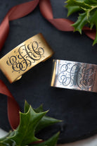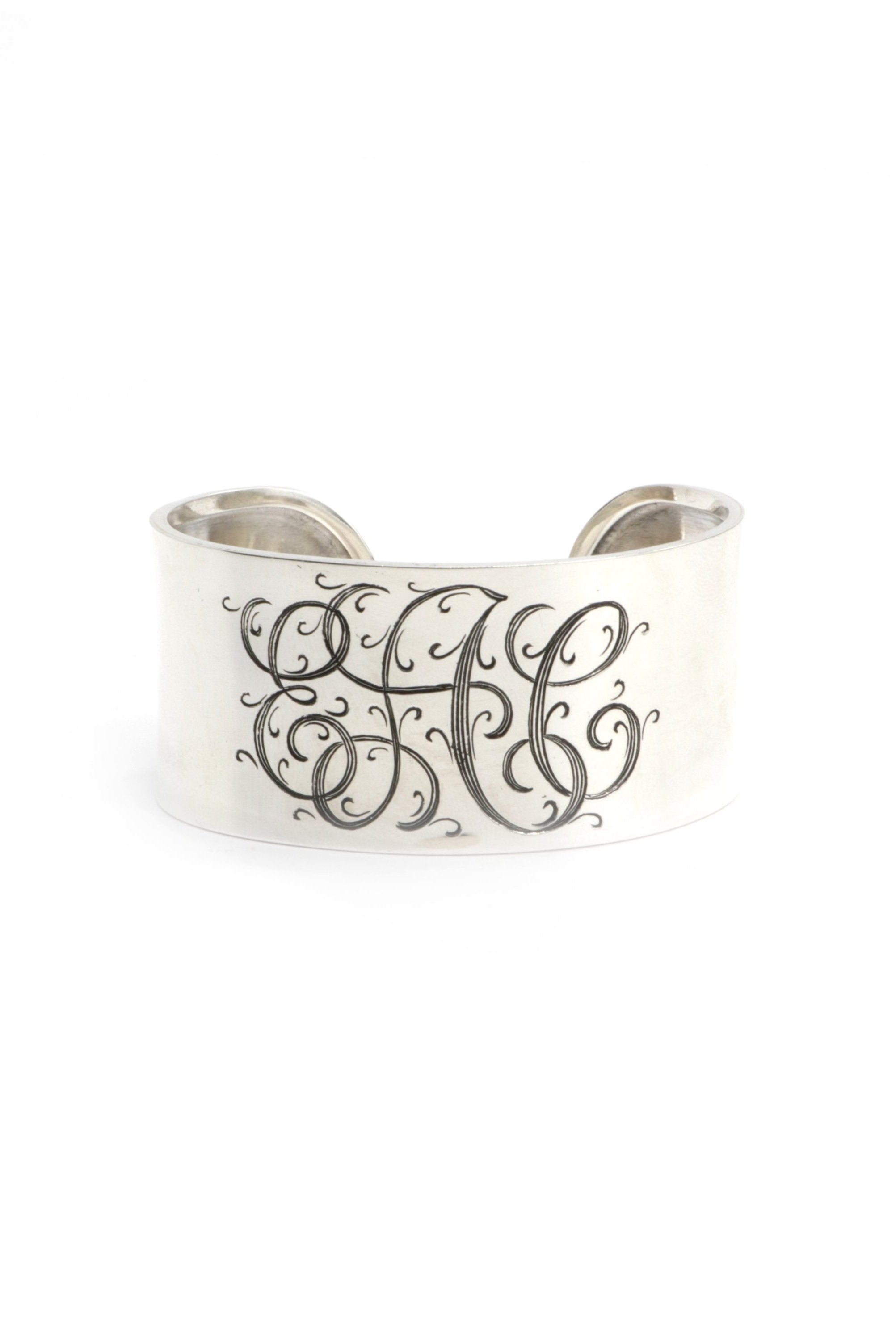 This exquisite hand-engraved silver cuff showcases a widow's monogram with timeless elegance. The intricate detailing and craftsmanship make it a remarkable piece that exudes sophistication and grace. This script font is hand engraved by a local artist. All of his engraving is unique & completely done by hand with no type of power tool.