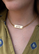 - Heavily plated in 18k gold and features a vintage I.D. plaque.