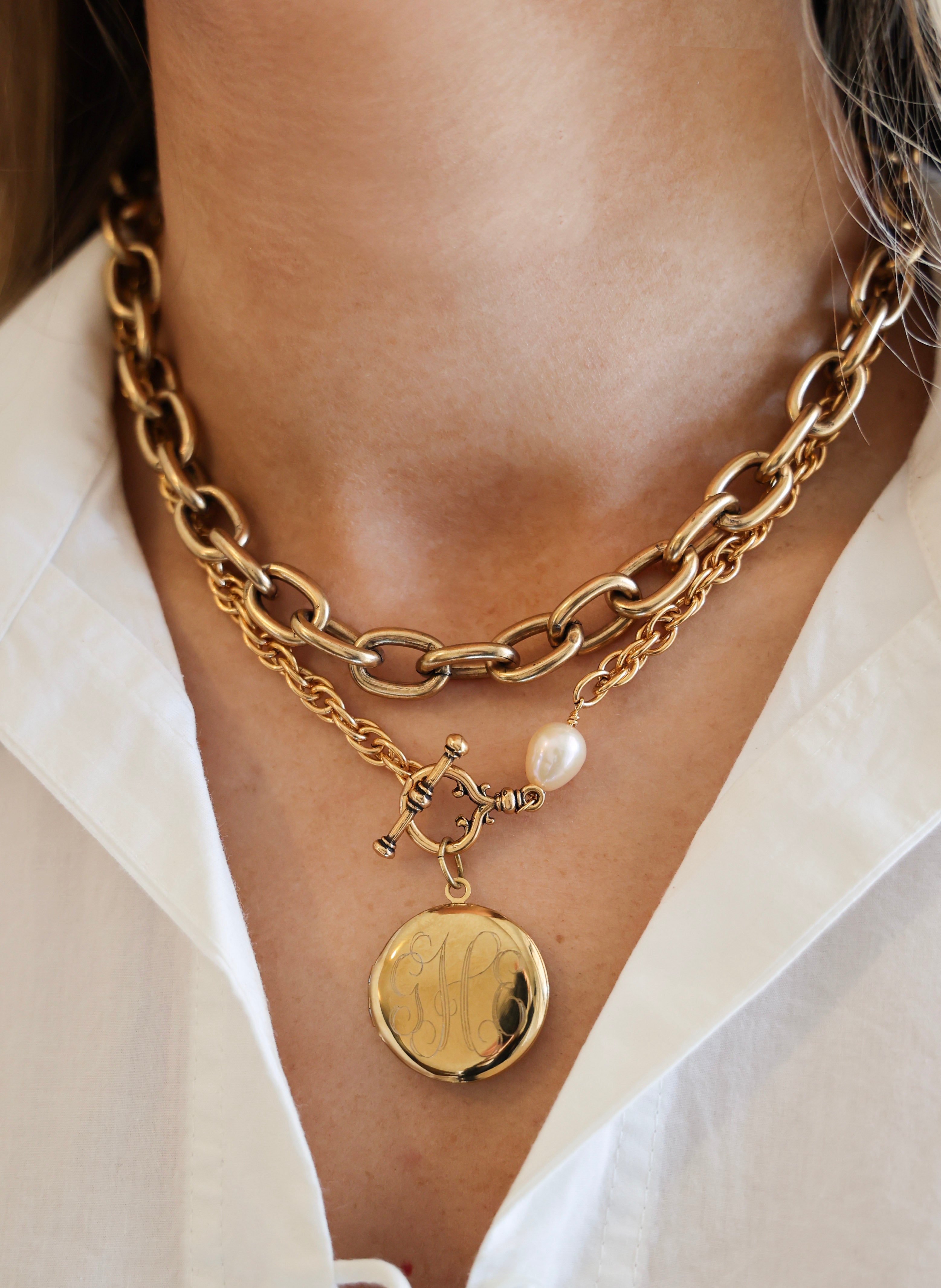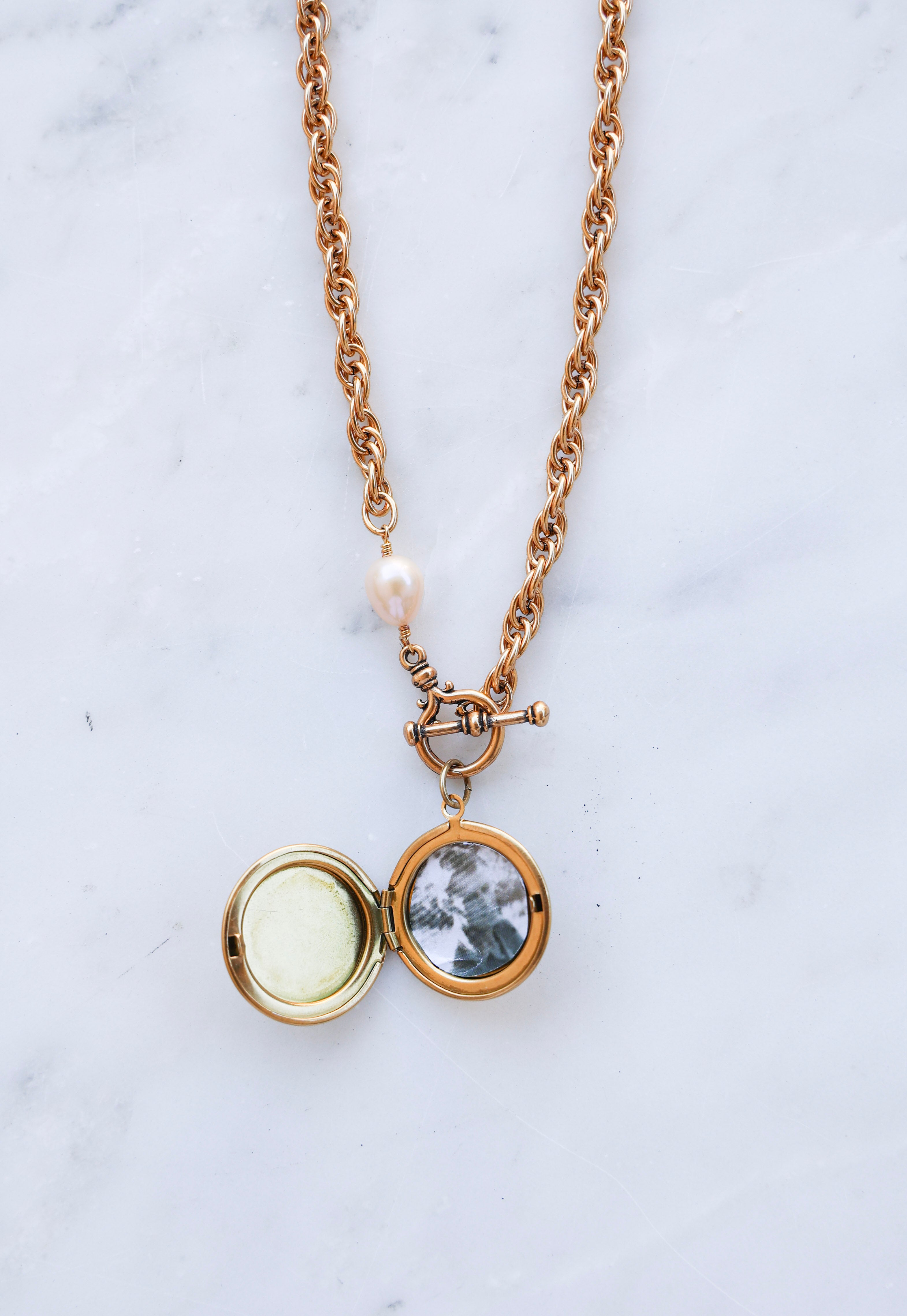 - 18" or 20" necklace features plated 18k gold chain with a protective matte finish, a natural freshwater pearl, and our exclusive ExVoto Vintage toggle closure at front.