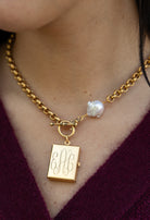 - 18" necklace featuring plated 18k gold chain with forever finish, a freshwater baroque pearl, and a book locket pendant.