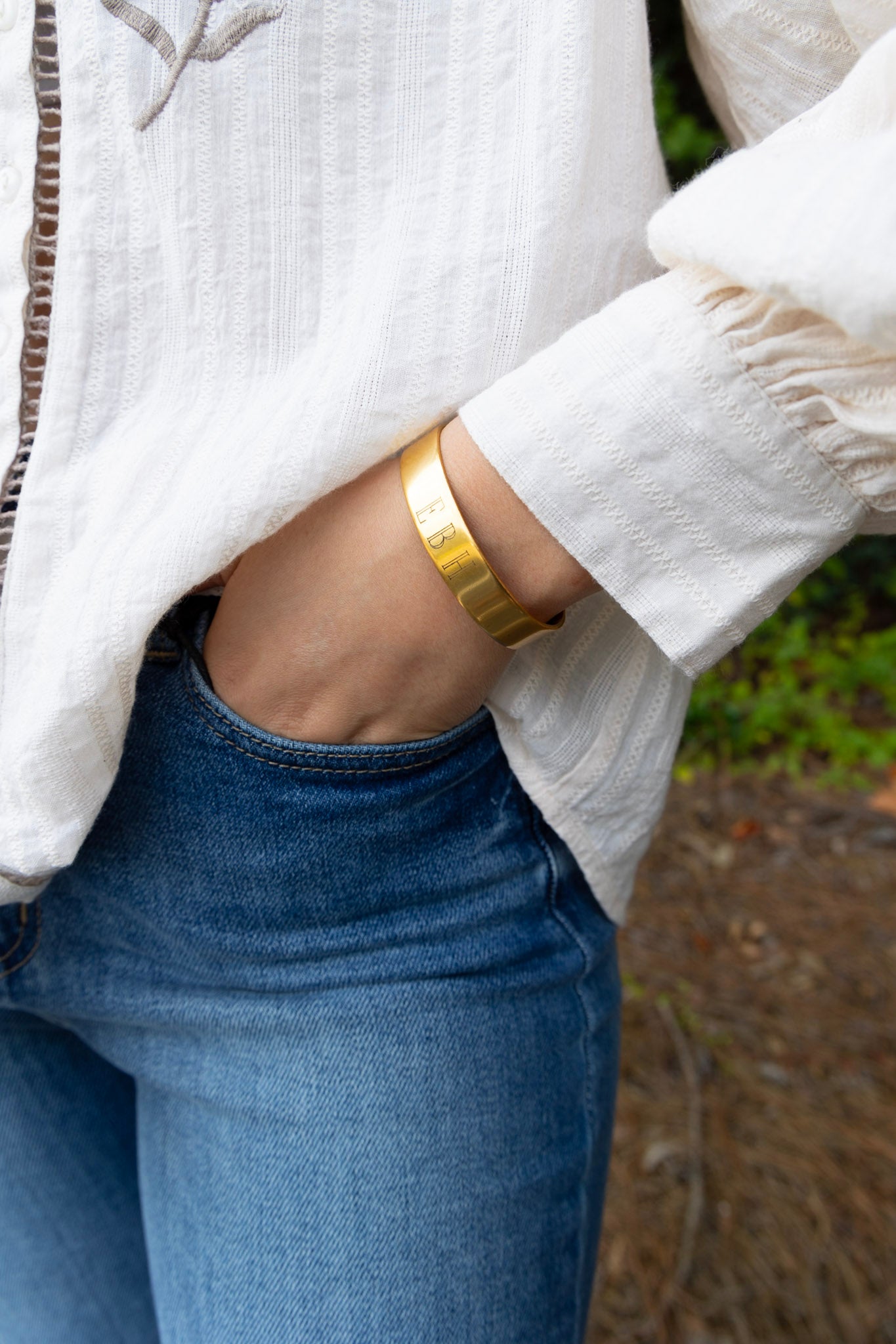 - 1/2" wide cuff is plated in 18K gold with an antiqued patina giving it a gorgeous, mellow tone.