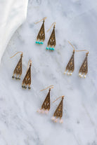 - Lightweight statement earrings created from vintage components with stone choices of pearl or turquoise