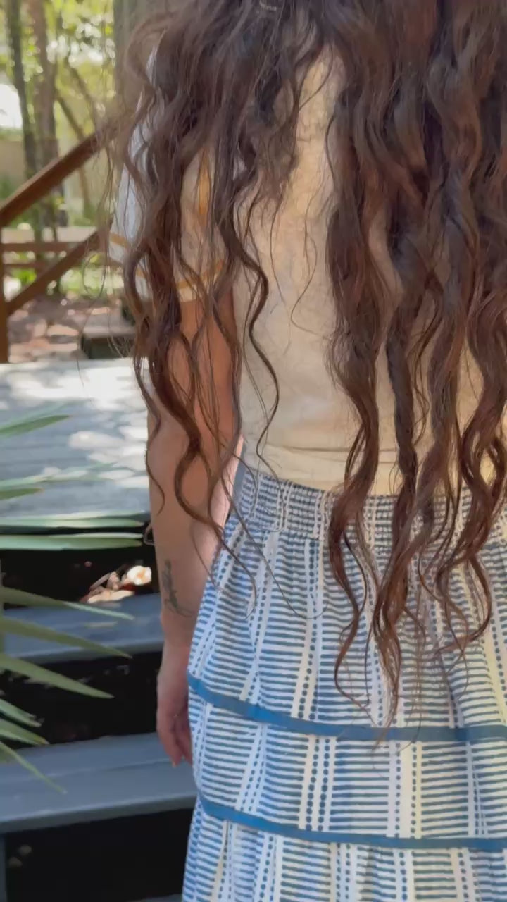 STYLE TIP: The Sasha Maxi Skirt in Daphne Blue Blockprint blends linen and cotton for a comfortable, versatile piece. It comes in just two sizes with a stretchy wide smocked waistband that adjusts to fit you perfectly. Style it as a skirt or a sleeveless dress by positioning the waistband higher. Layer it with a rope belt to cinch the waist, or pair it with the coordinating Poppy Blouse!