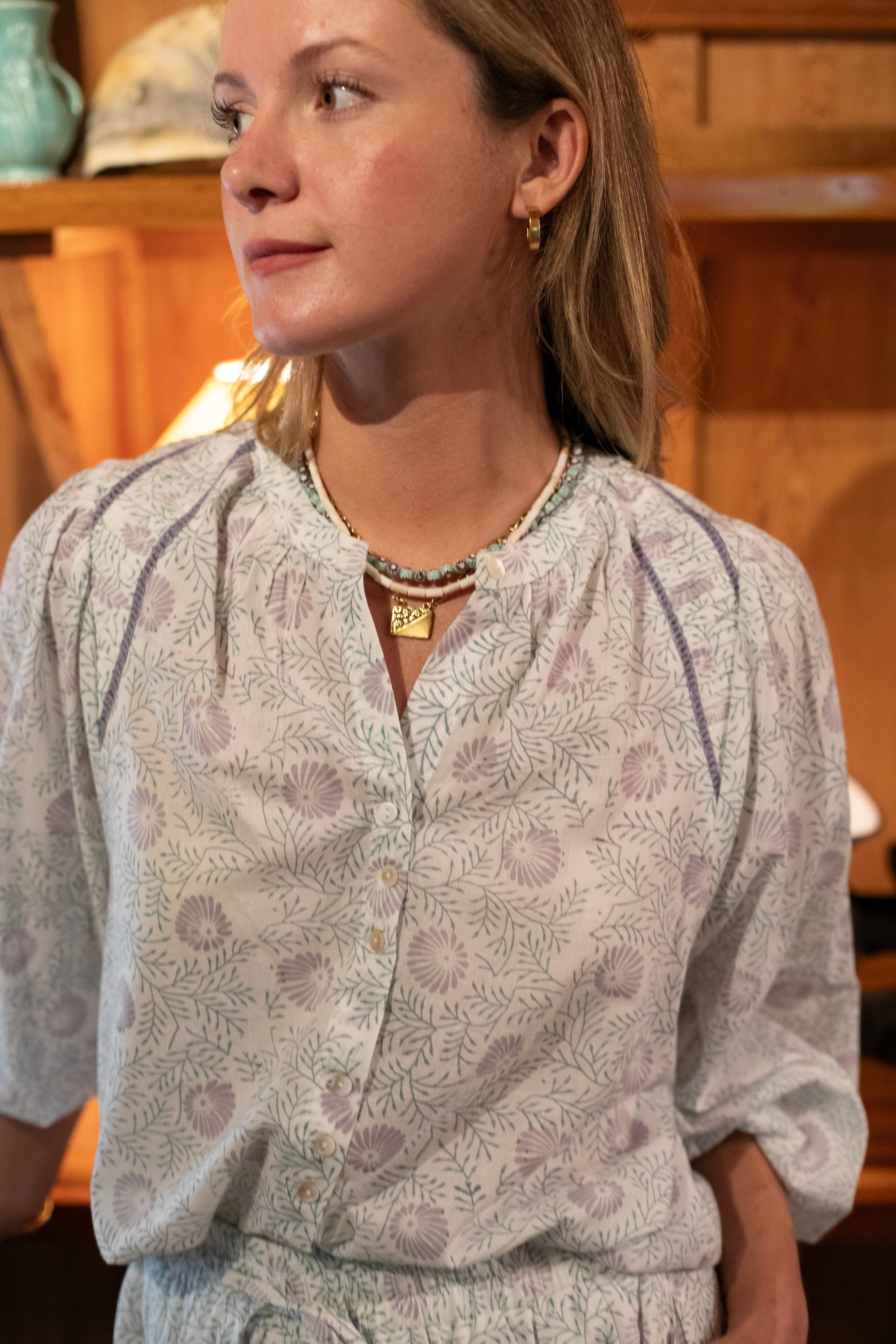 Greta Blouse in Lavender & Mineral Blue Blockprint by ExVoto