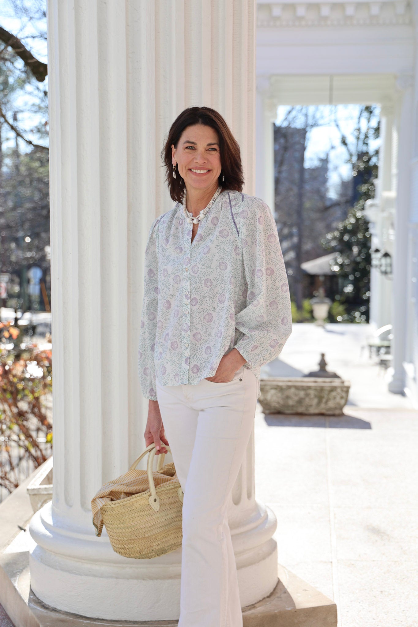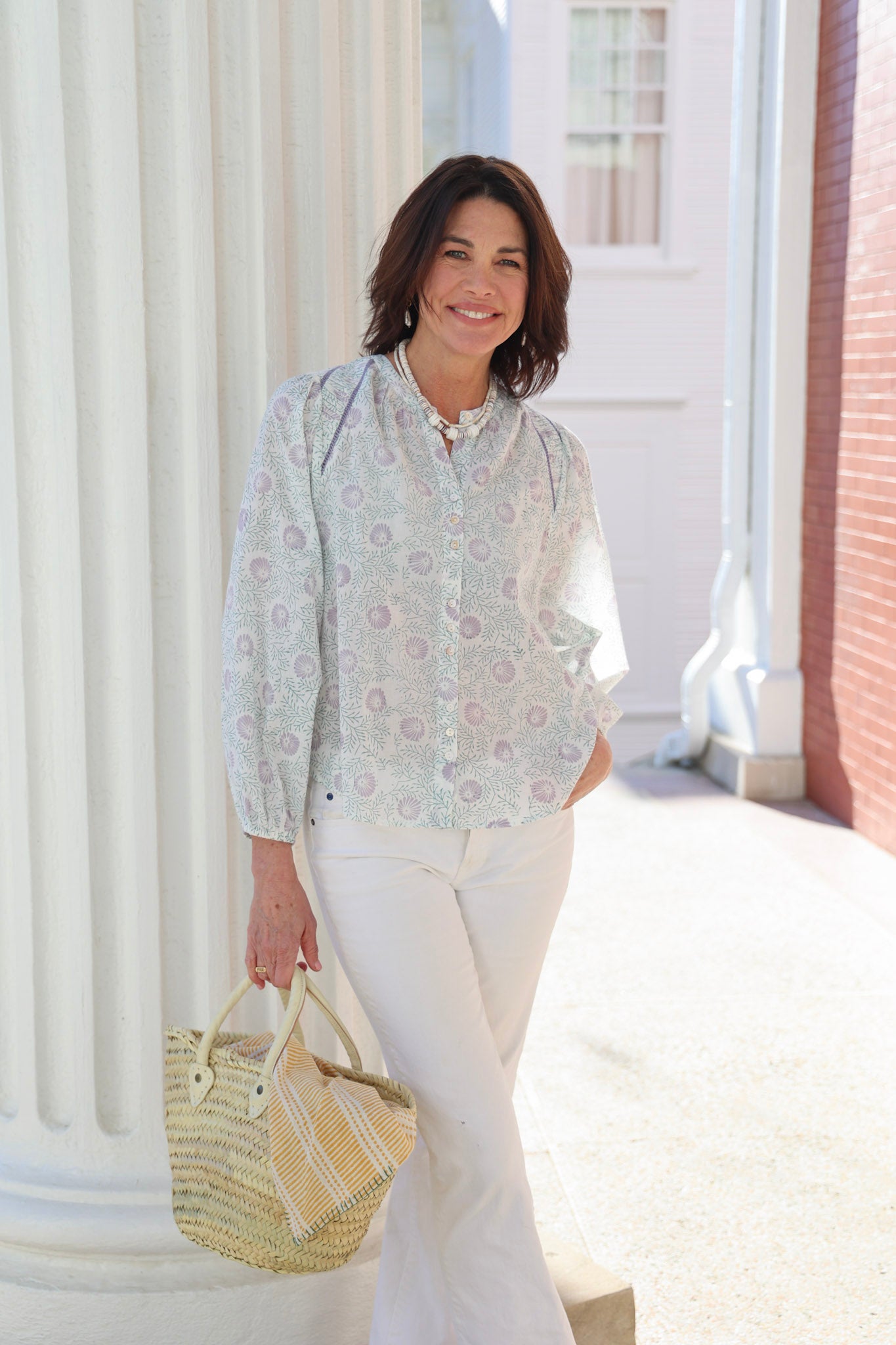 STYLE TIP: Crafted from crisp cotton, this blouse showcases a striking lavender and mineral blue blockprint design. Long sleeves with elastic wrists let you adjust the fit effortlessly—roll them up for warm weather or keep them down for cooler days. The timeless pattern and neutral base make it easy to style year-round, whether you're pairing it with summer shorts or layering it under a jacket.