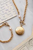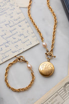 - Includes matching 7.5" bracelet and 18" necklace featuring plated 18k gold chain with a protective matte finish, natural freshwater pearls, and our exclusive ExVoto Vintage toggle closure at front.
