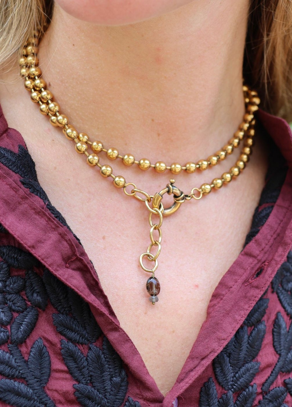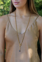 - 33″ necklace featuring a labradorite and smoky quartz drop pendant.