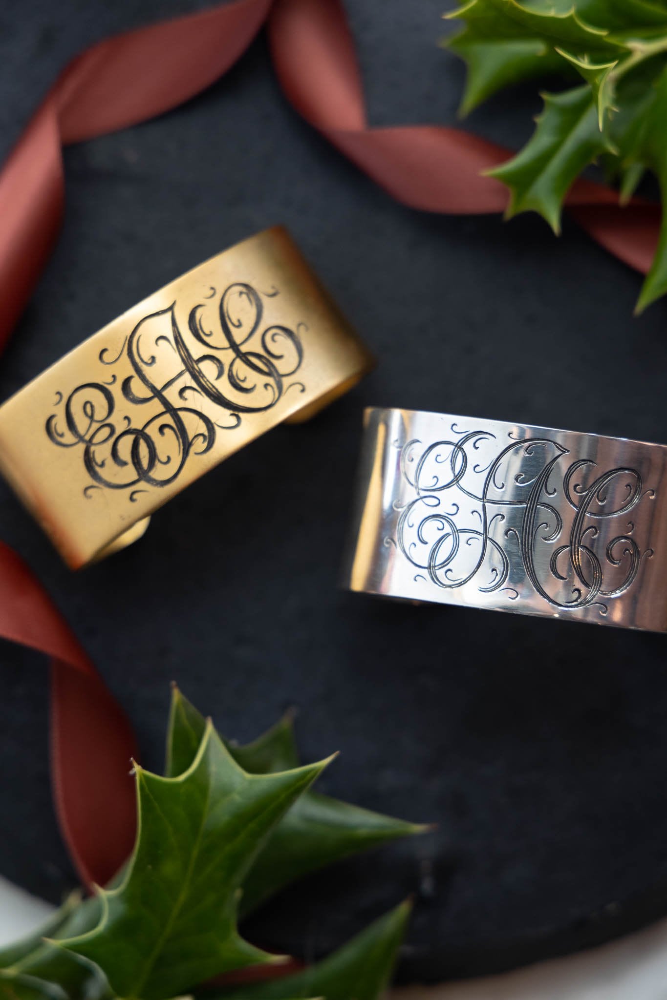 - Featuring your monogram engraved in a script font