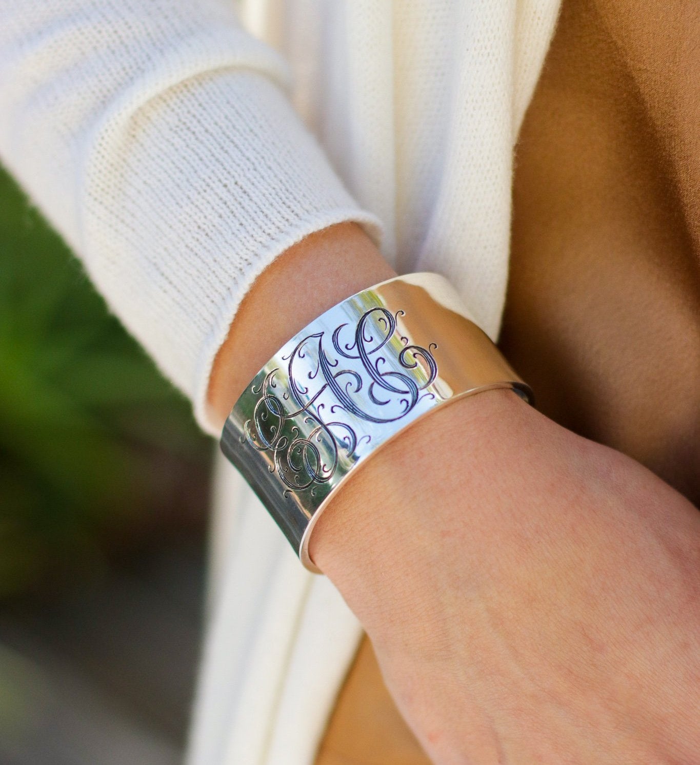 This exquisite hand-engraved silver cuff showcases a widow's monogram with timeless elegance. The intricate detailing and craftsmanship make it a remarkable piece that exudes sophistication and grace. This script font is hand engraved by a local artist. All of his engraving is unique & completely done by hand with no type of power tool.