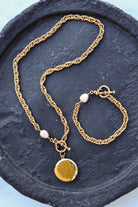 - Includes matching 7.5" bracelet and 18" or 20" necklace featuring plated 18k gold chain with a protective matte finish, natural freshwater pearls, and our exclusive ExVoto Vintage toggle closure at front.