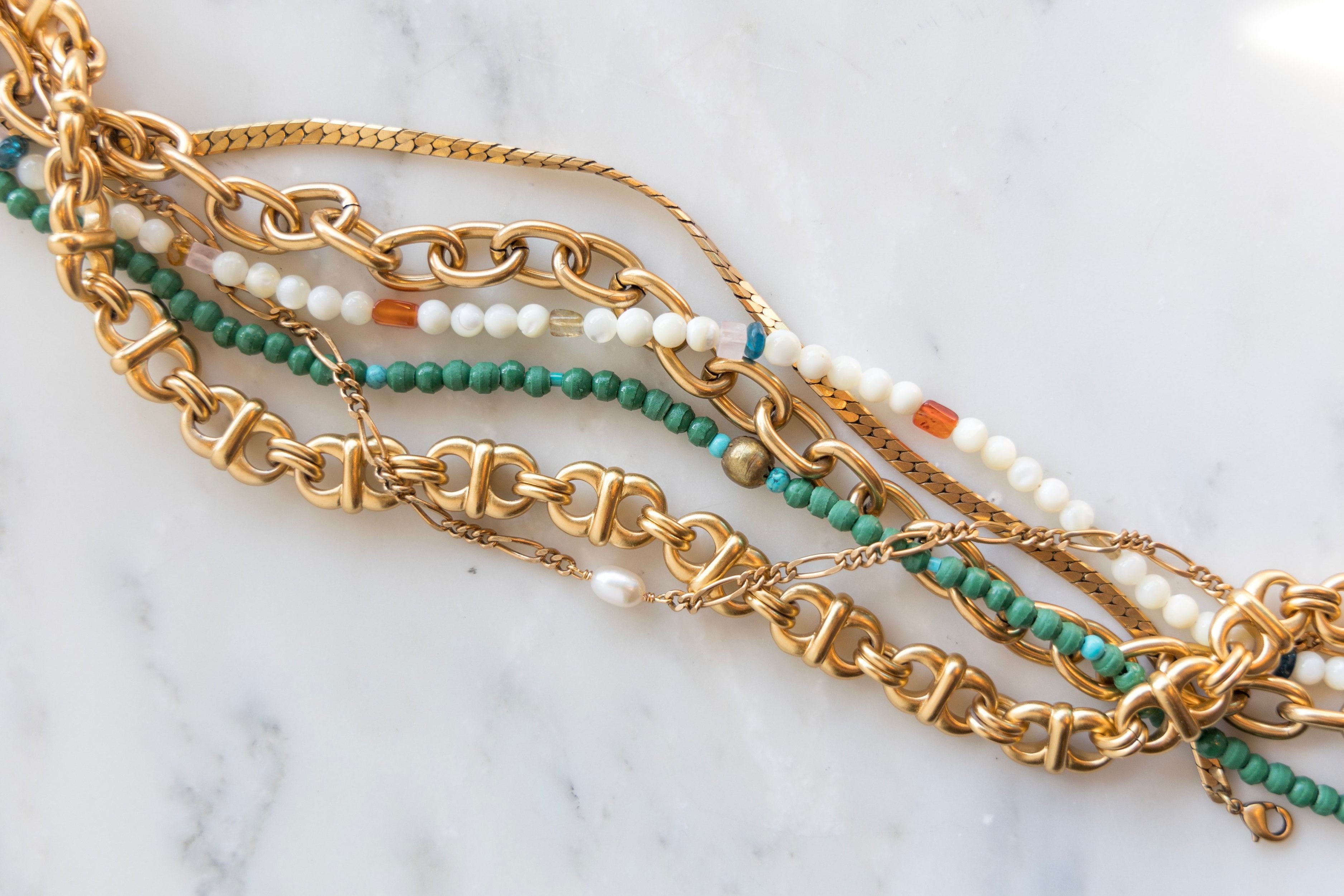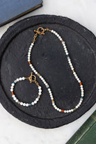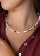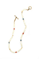 - 18” Esther Necklace featuring genuine mother of pearl, rose quartz, apatite, carnelian, citrine, and our exclusive toggle closure.