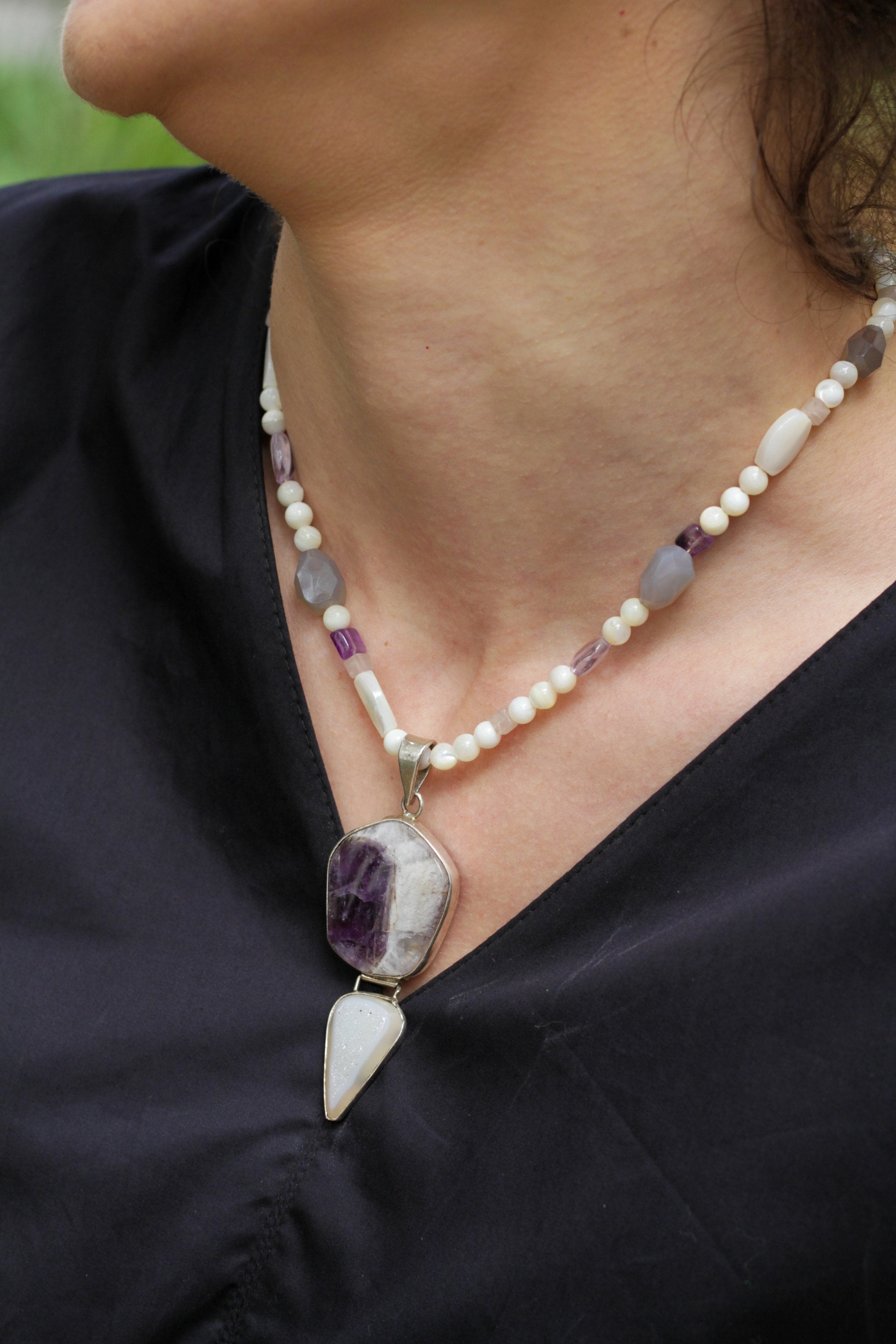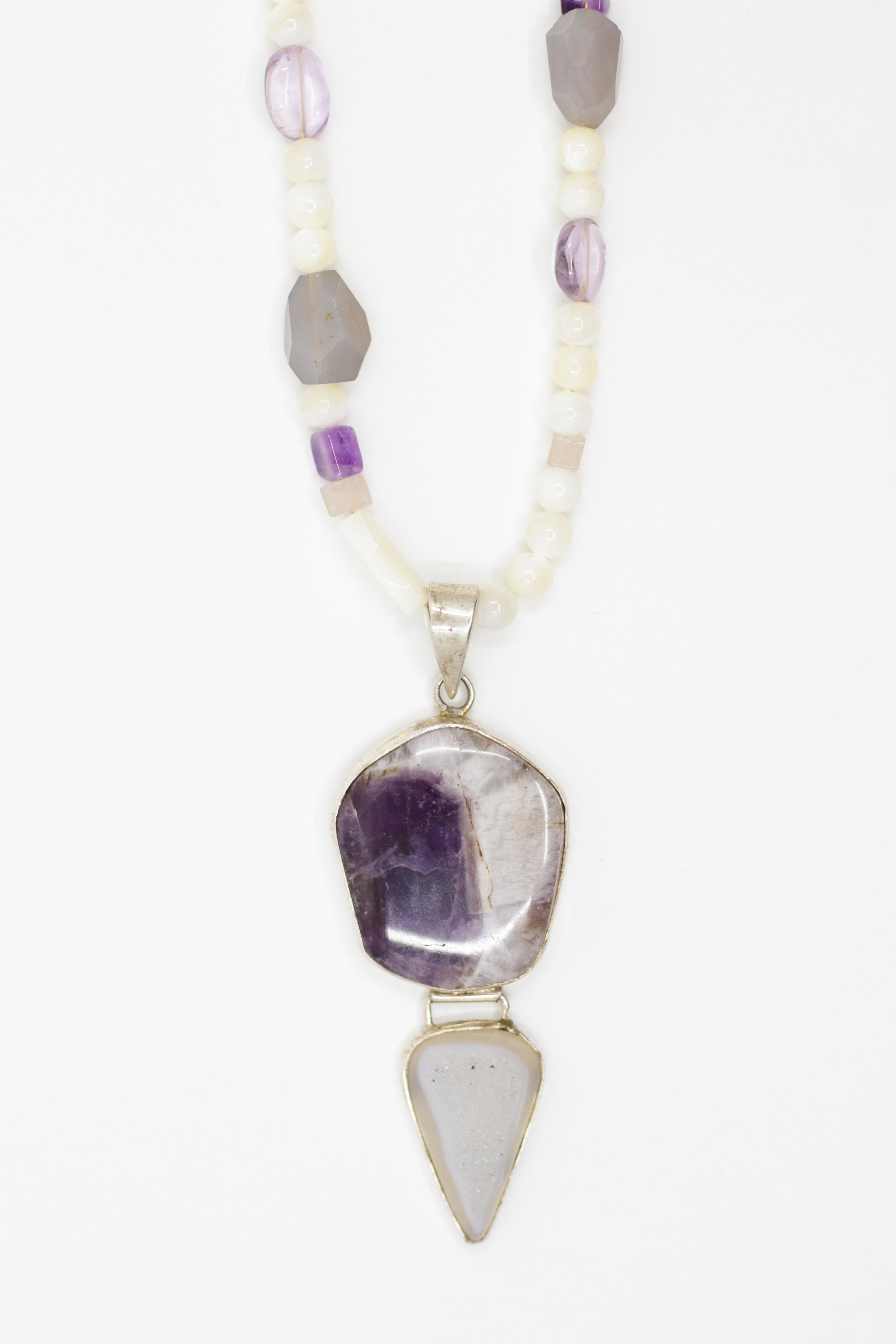 This 18” Esther Necklace features genuine mother of pearl, semi-precious amethyst stones, semi-precious moonstones, semi-precious rose quartz and our exclusive toggle closure. This necklace features a one of a kind, pendant made from amethyst, frizzy quartz stone, and silver. This pendant was made by an artist Elizabeth met while in Mexico.
