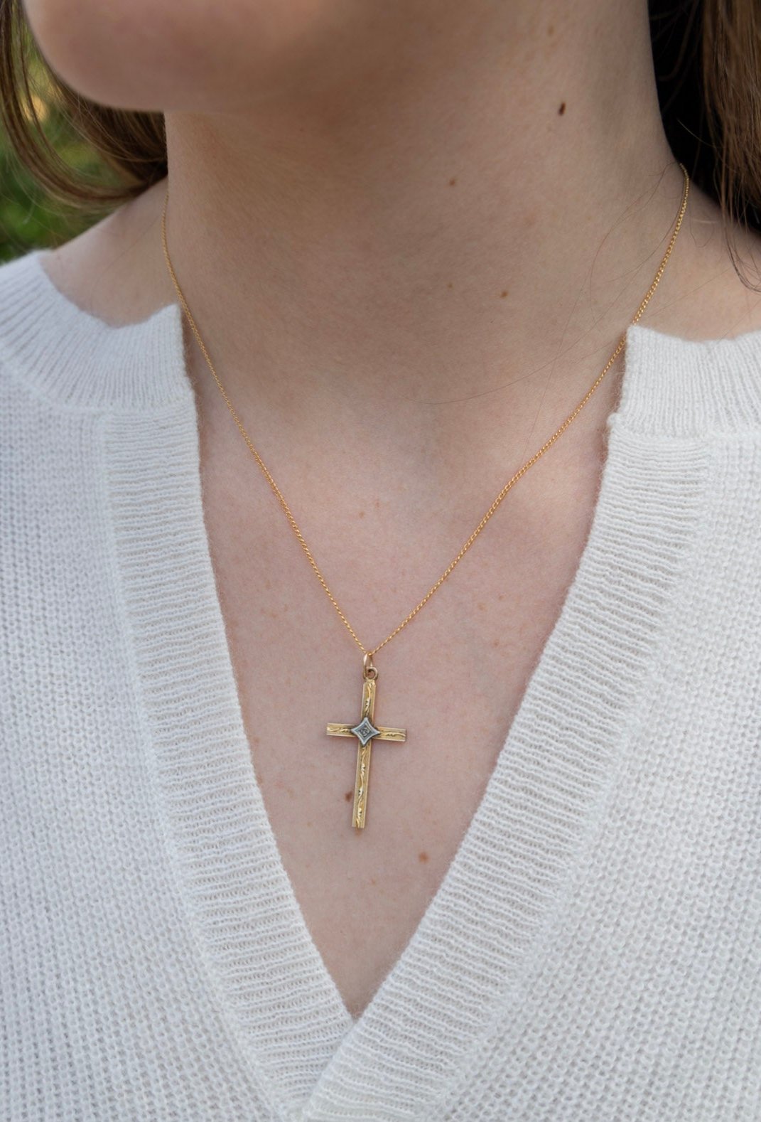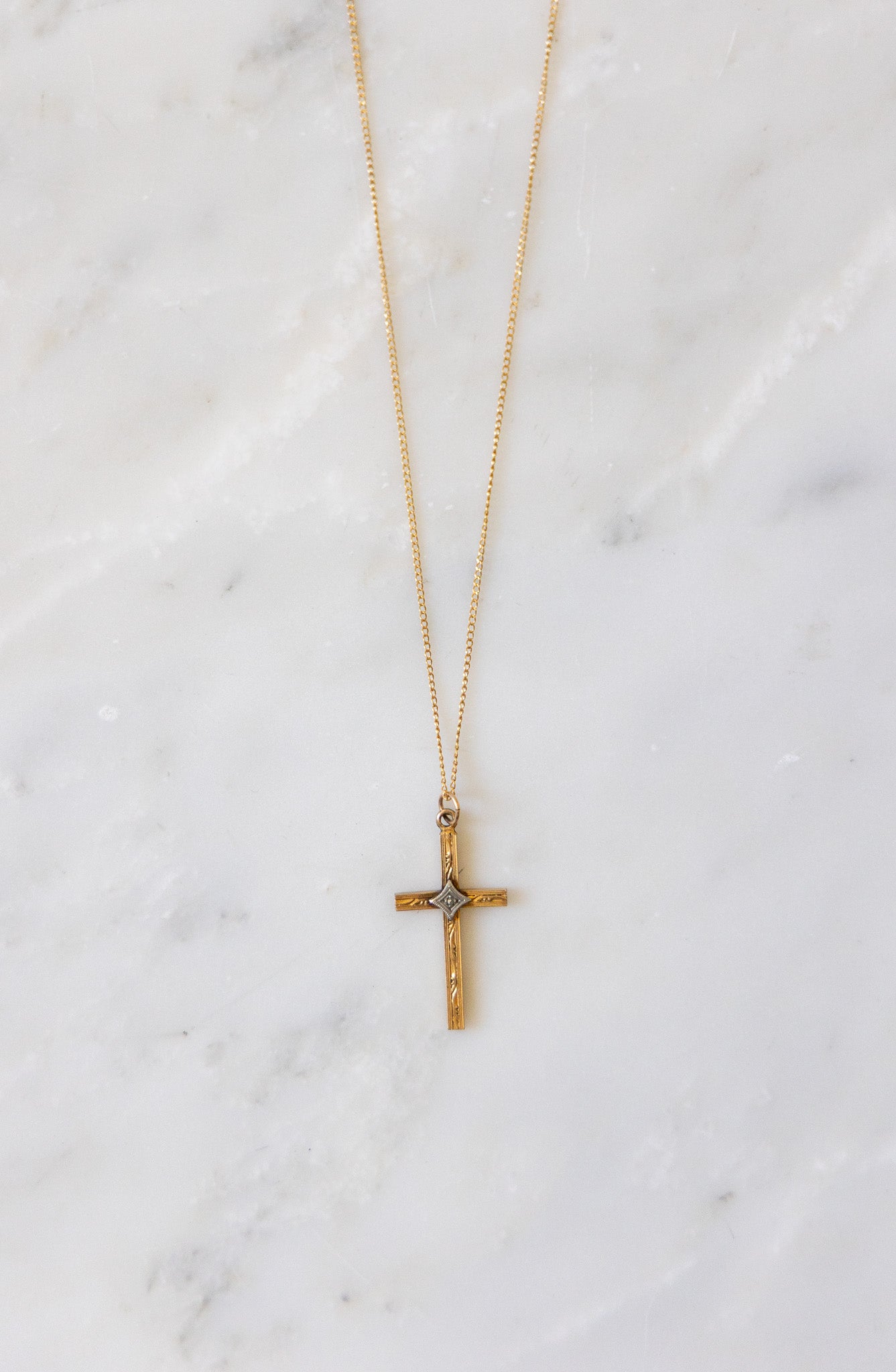 18" necklace features a petite gold filled chain with a lobster claw clasp closure at the back. This necklace features a one of a kind, antique, two toned cross pendant that is 100 years old or more