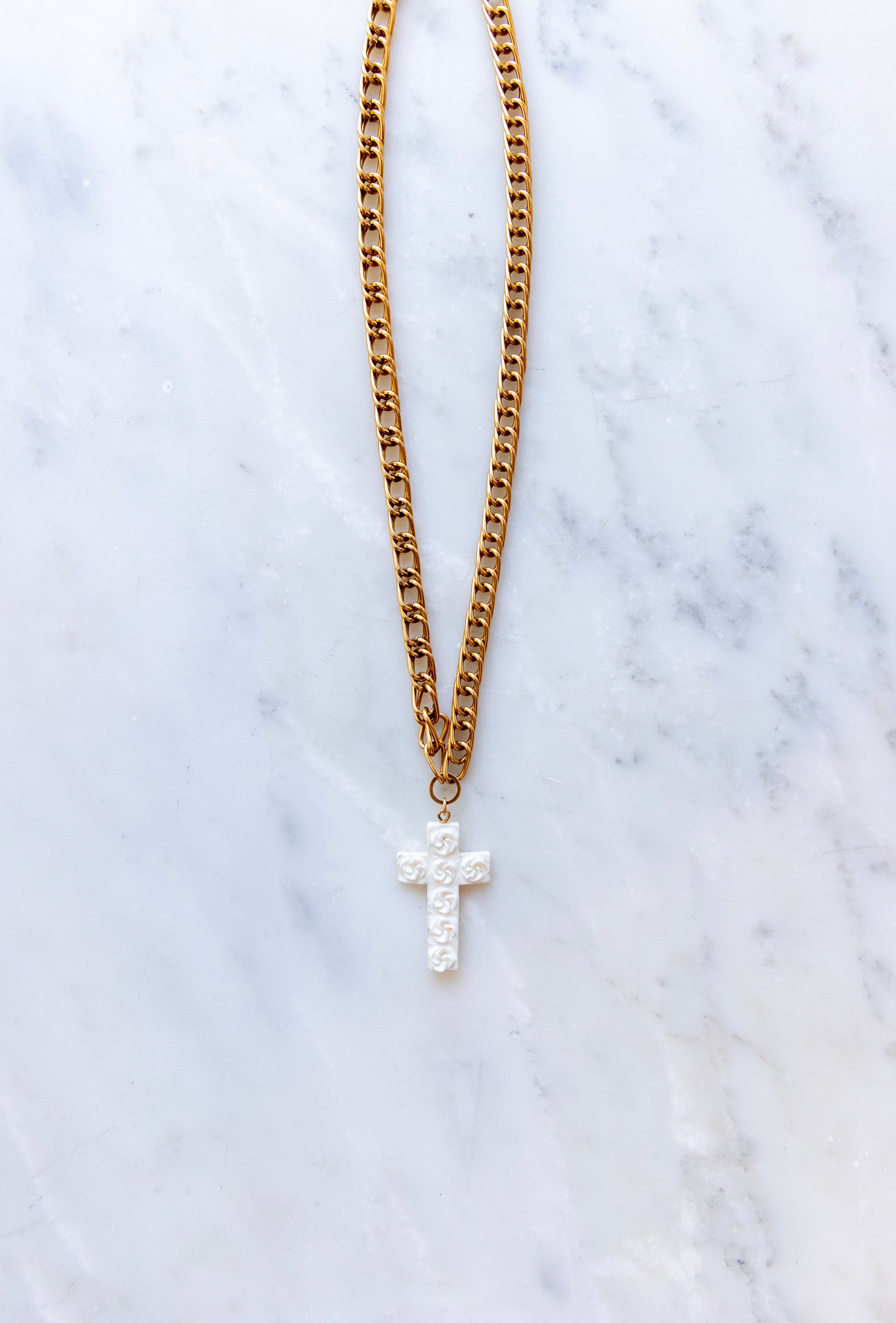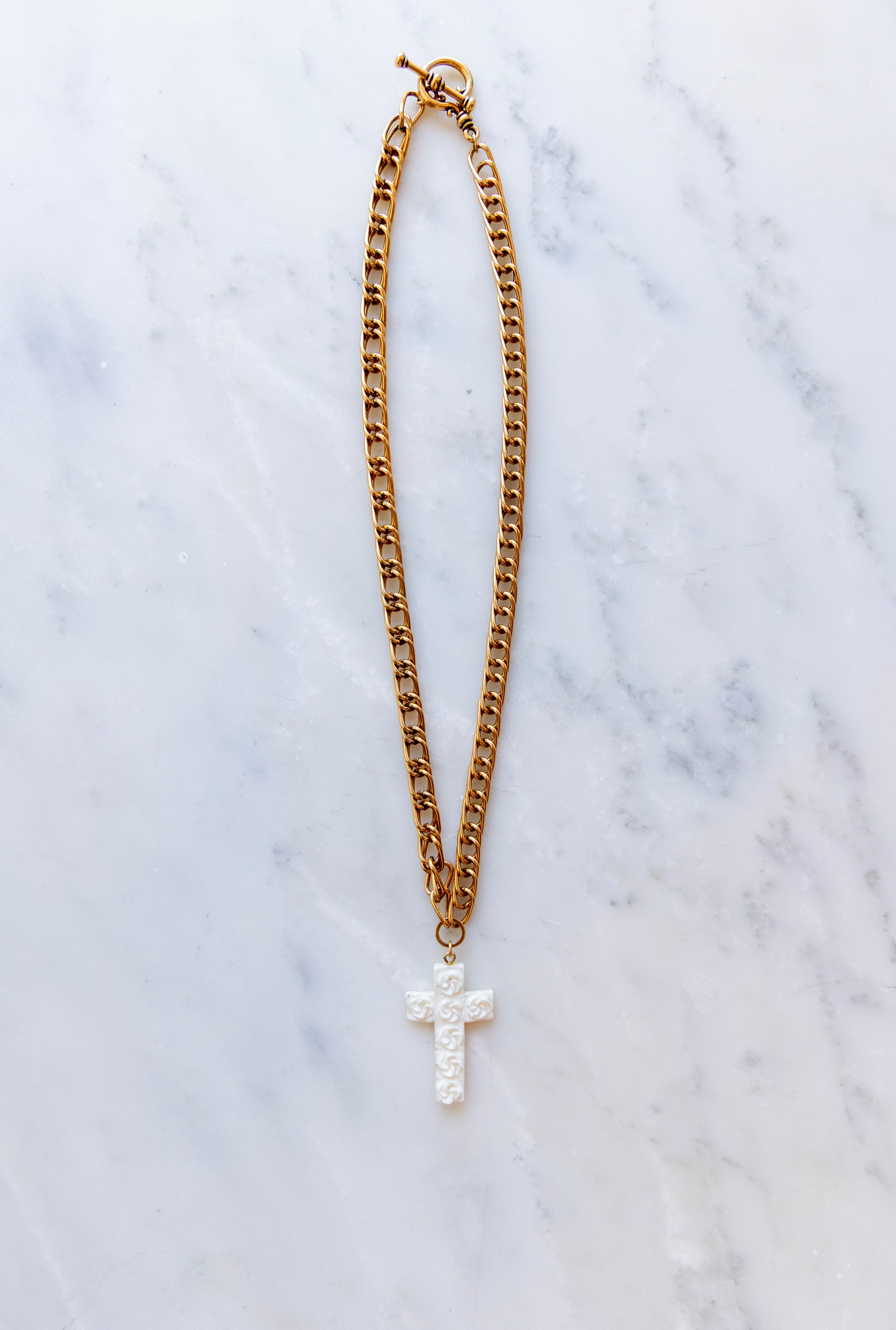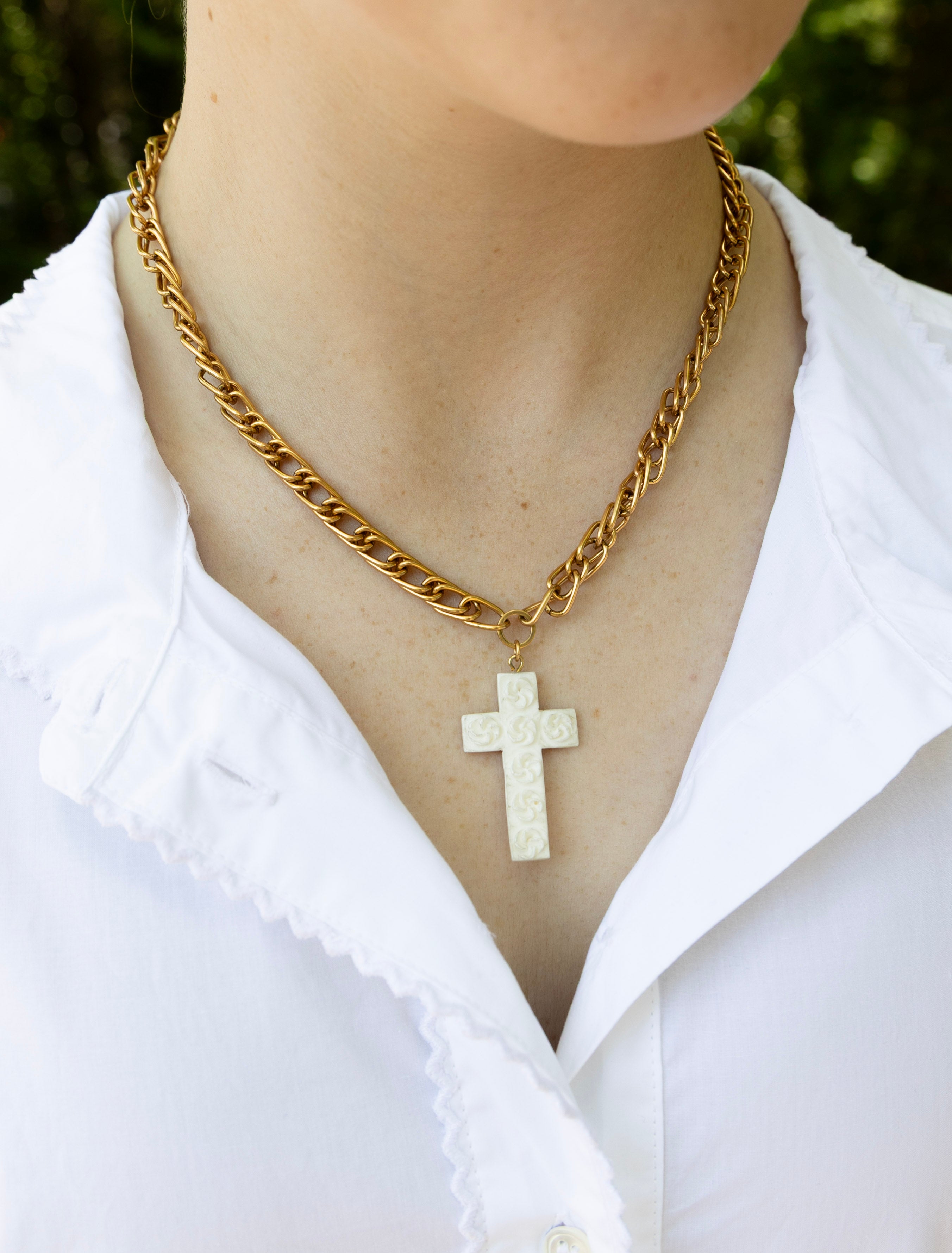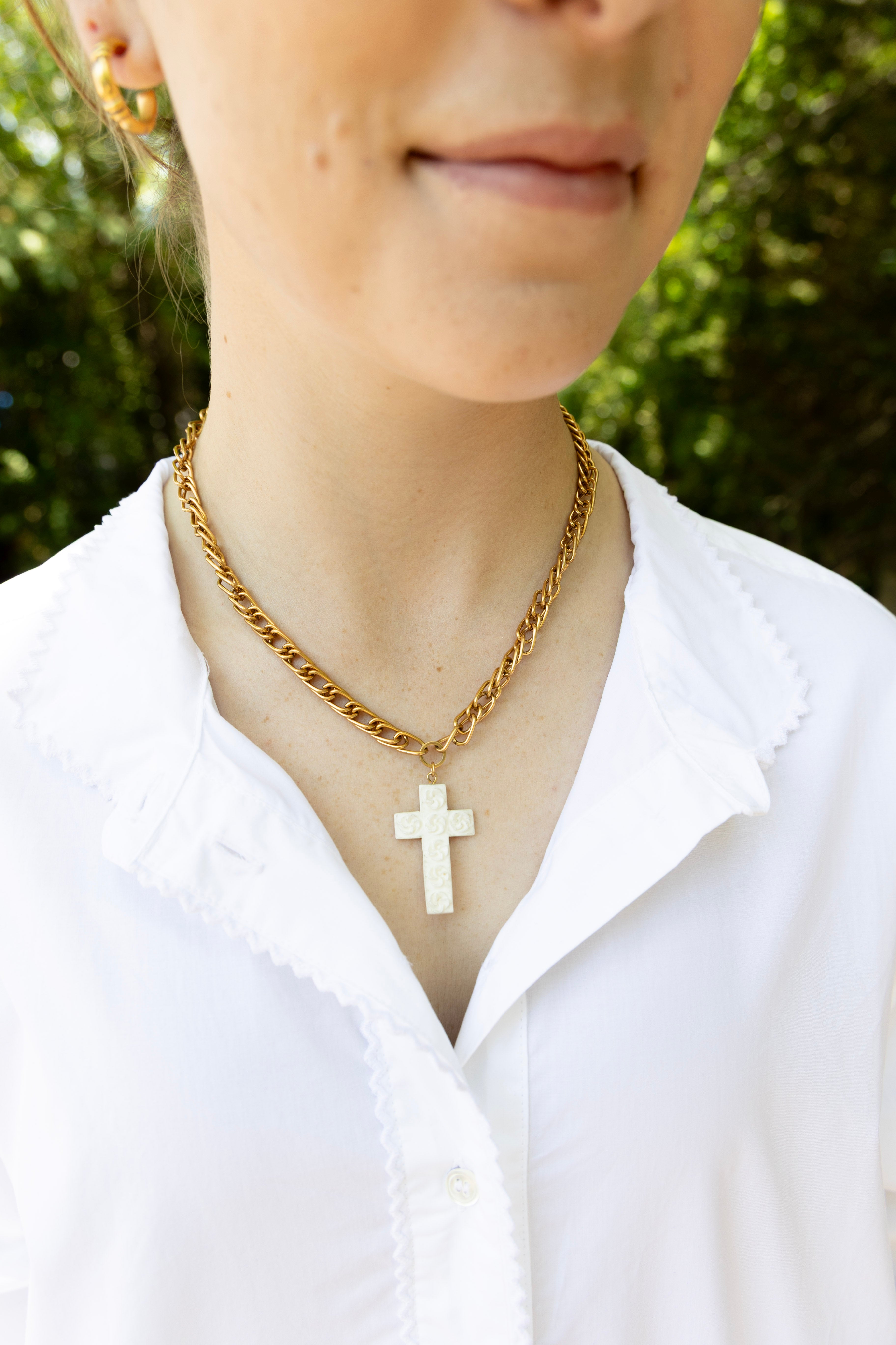 This 18" necklace features plated 18k gold chain with a protective matte finish and our Exclusive ExVoto Vintage toggle closure at the back. The necklace features a genuine antique ivory cross pendant discovered in Paris by our owner and founder Elizabeth Adams.