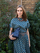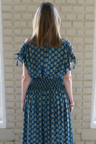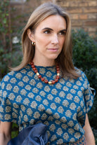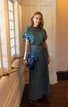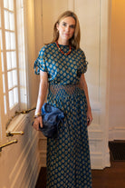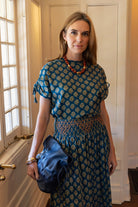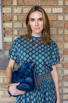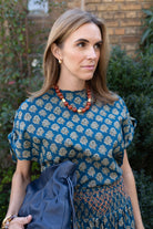 STYLE TIP: A versatile one size skirt! Dress her down with sandals, and dress her up with a heel. Need the skirt to be a little longer, or shorter? Slide the skirt down or up on the waist to adjust the length to suit you perfectly! In a beautiful teal blockprint with orange embroidery detail at waistband.