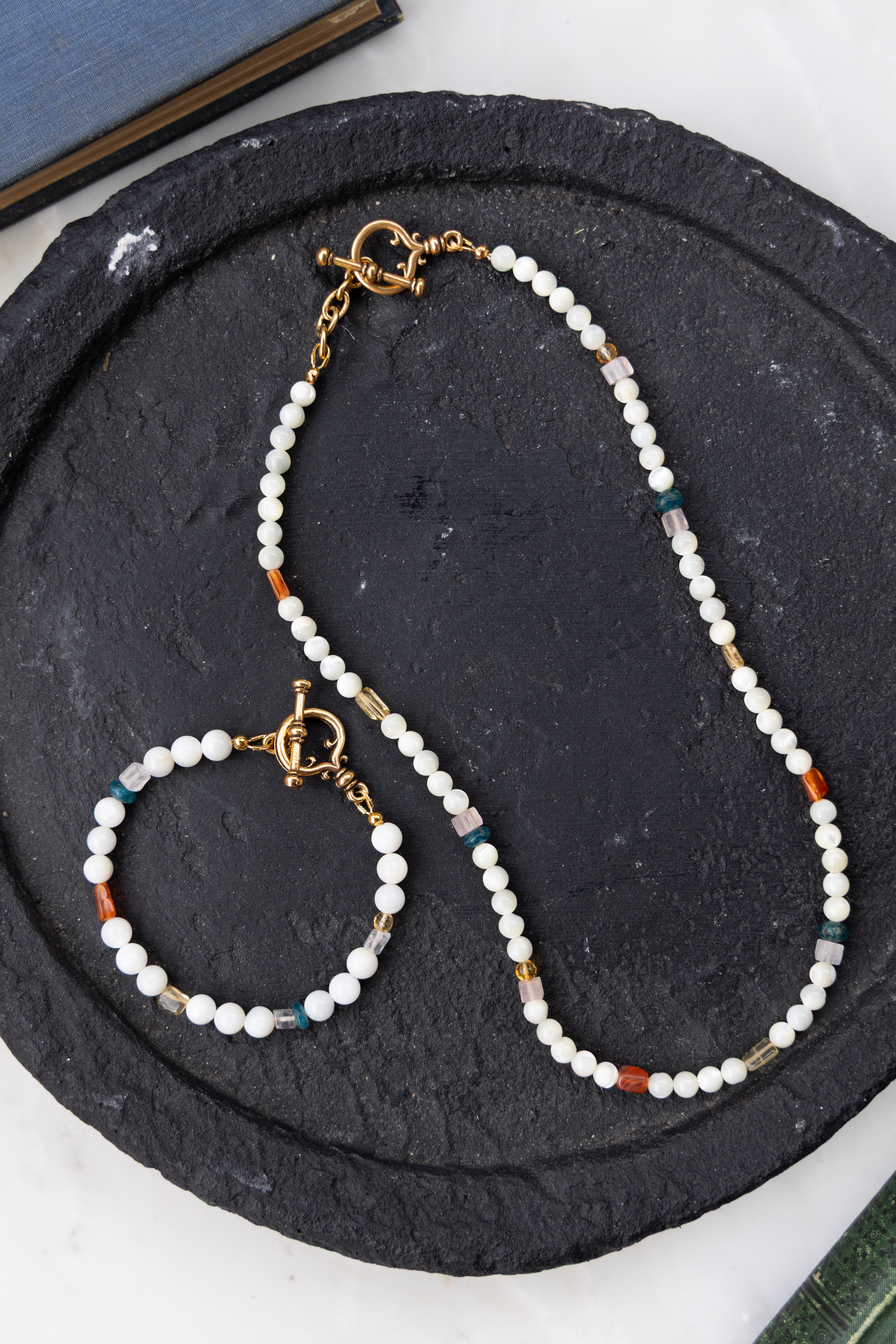 - 18” Esther Necklace featuring genuine mother of pearl, rose quartz, apatite, carnelian, citrine, and our exclusive toggle closure.