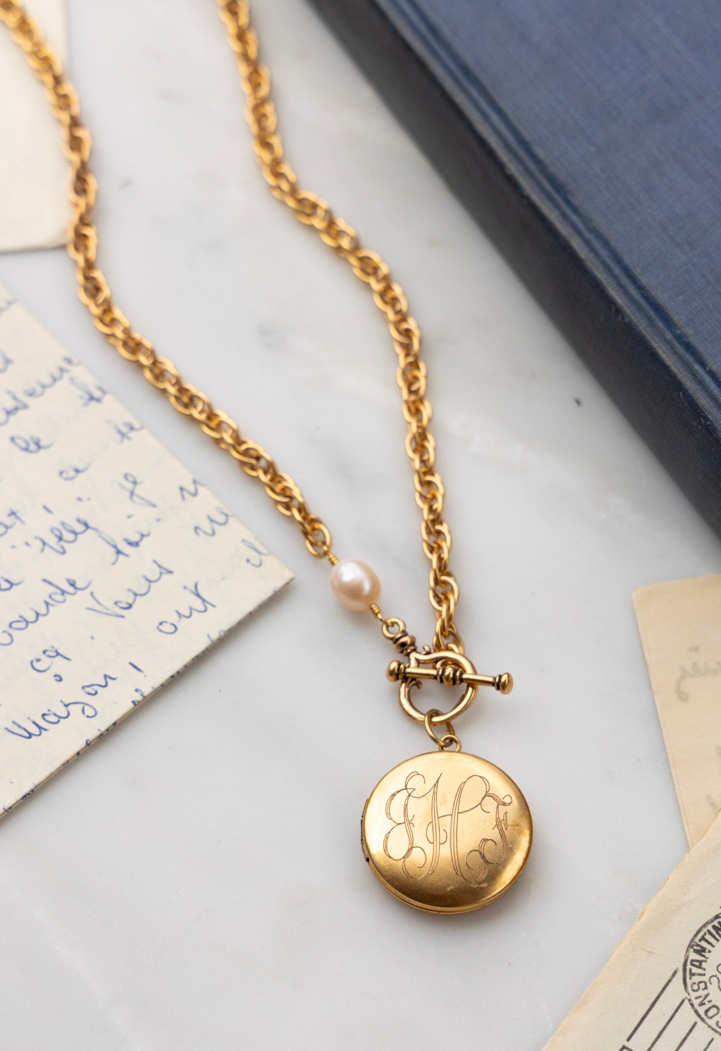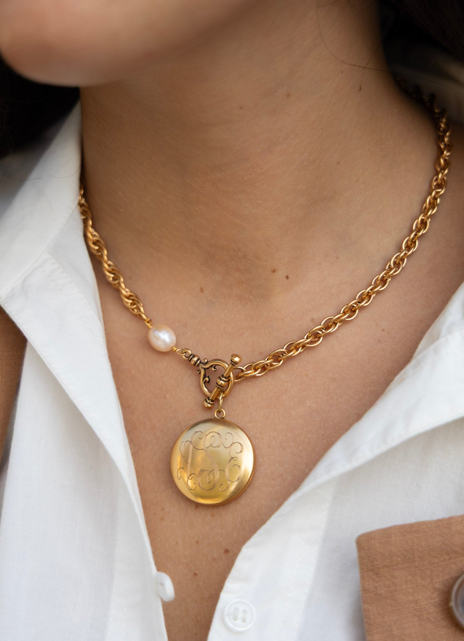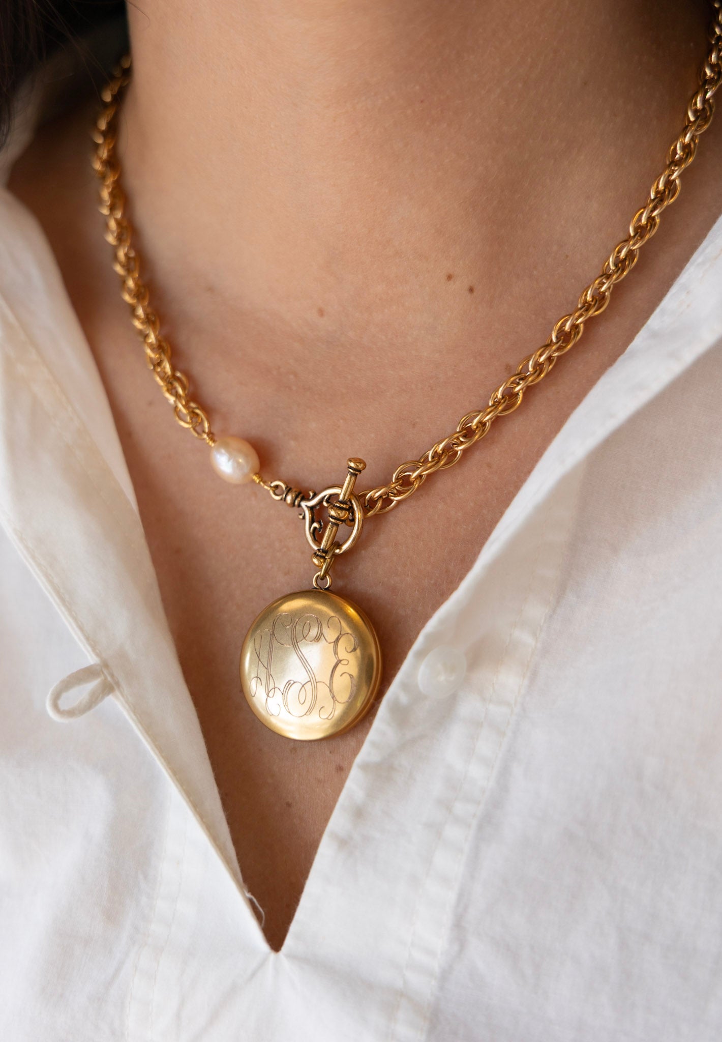 - 18" necklace features plated 18k gold chain with a protective matte finish, a natural freshwater pearl, and our exclusive ExVoto Vintage toggle closure at front.