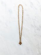 - 18″ necklace with gold plated chain featuring a lobster clasp closure.