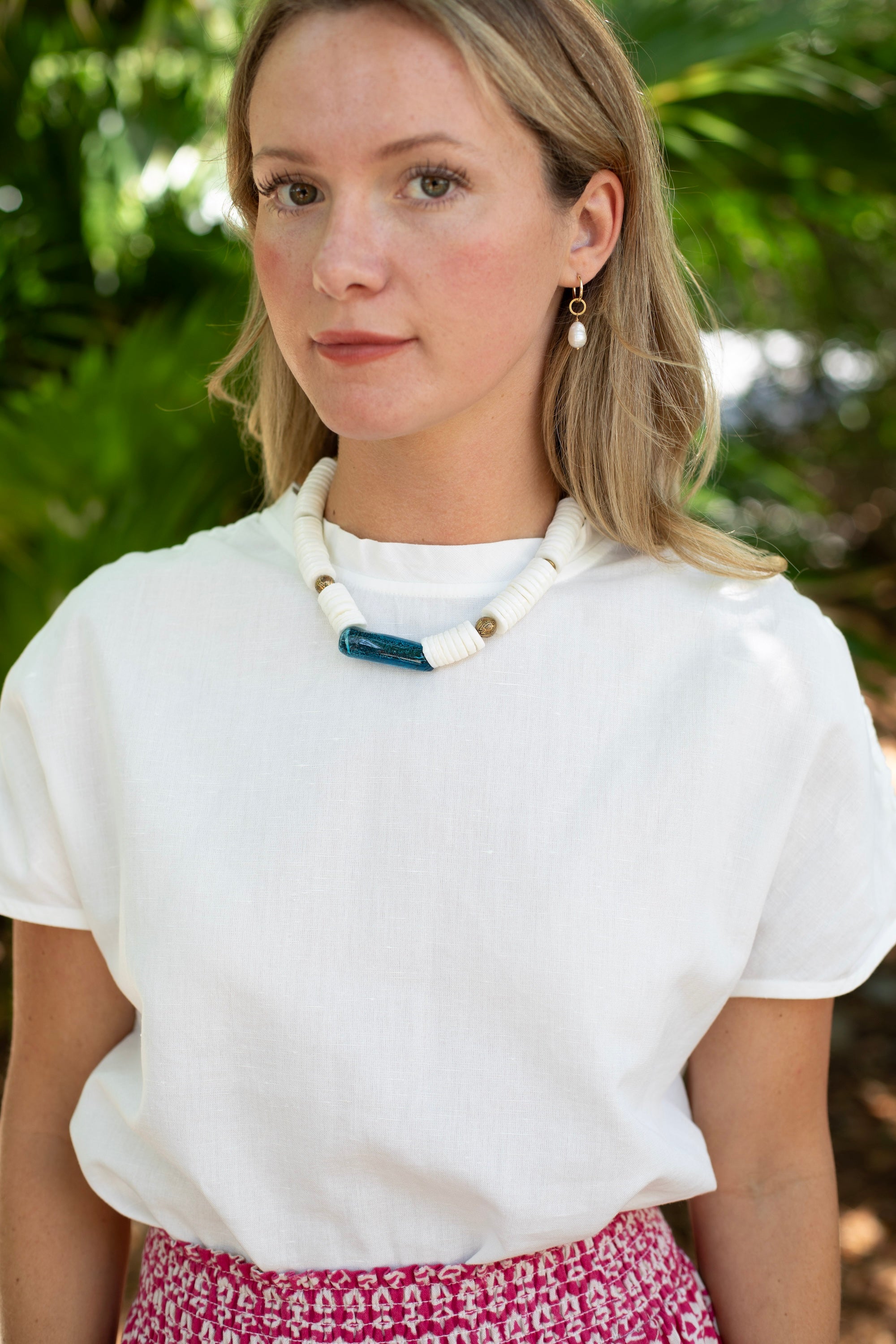 16"-18" adjustable necklace with small sailor clasp closure featuring white shells, brass beads, and one blue glass bead in the center.