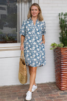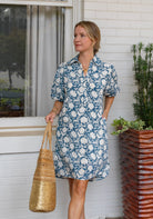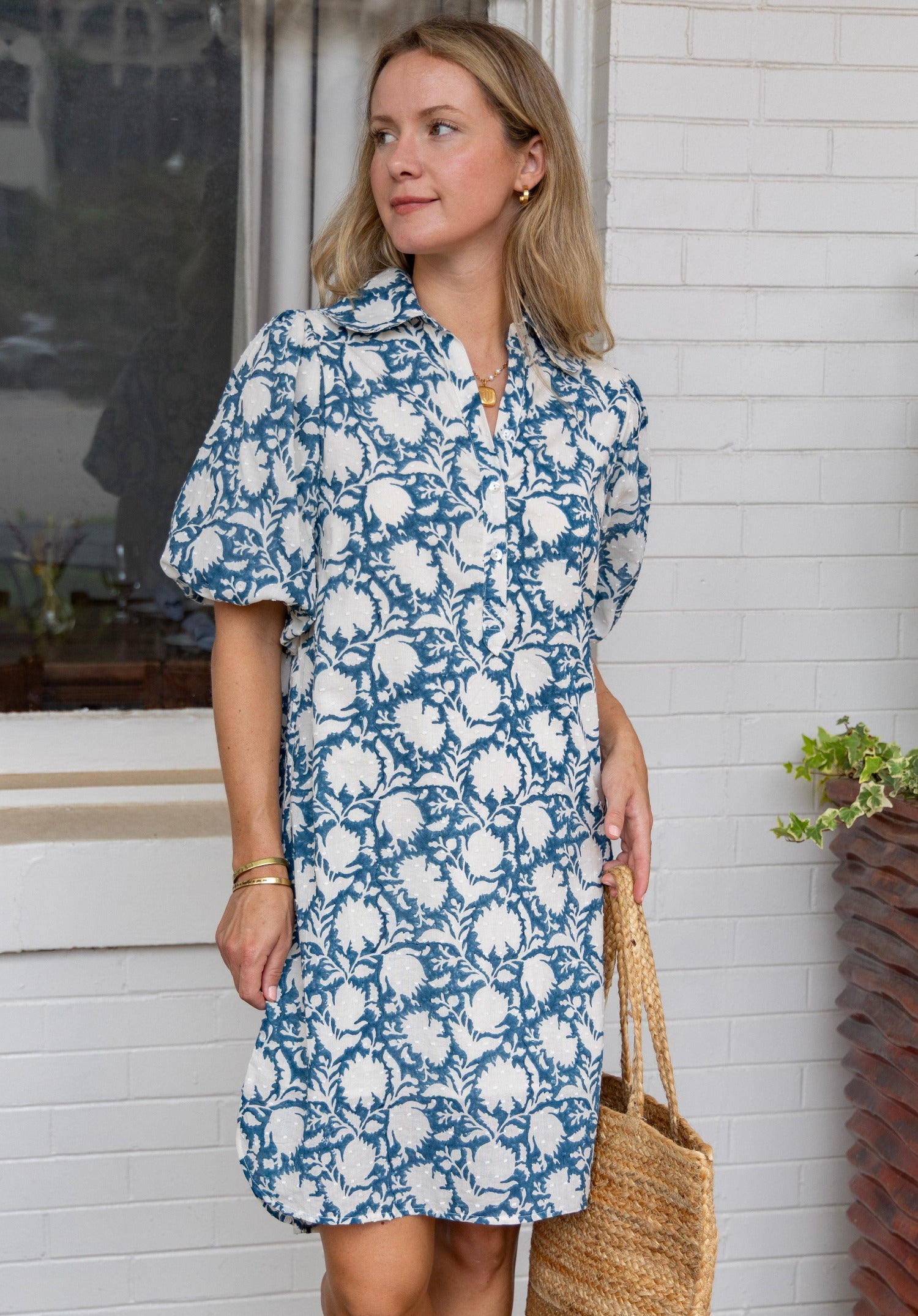 STYLE TIP: Made from soft cotton Swiss Dot fabric in teal blockprint, this charming dress showcases a timeless half-button shirt dress design with a delicate peter pan collar and puffed sleeves. Cinch the sash at your waist for definition, or skip it entirely and style with sneakers for an effortless, relaxed vibe.