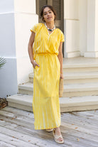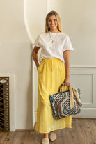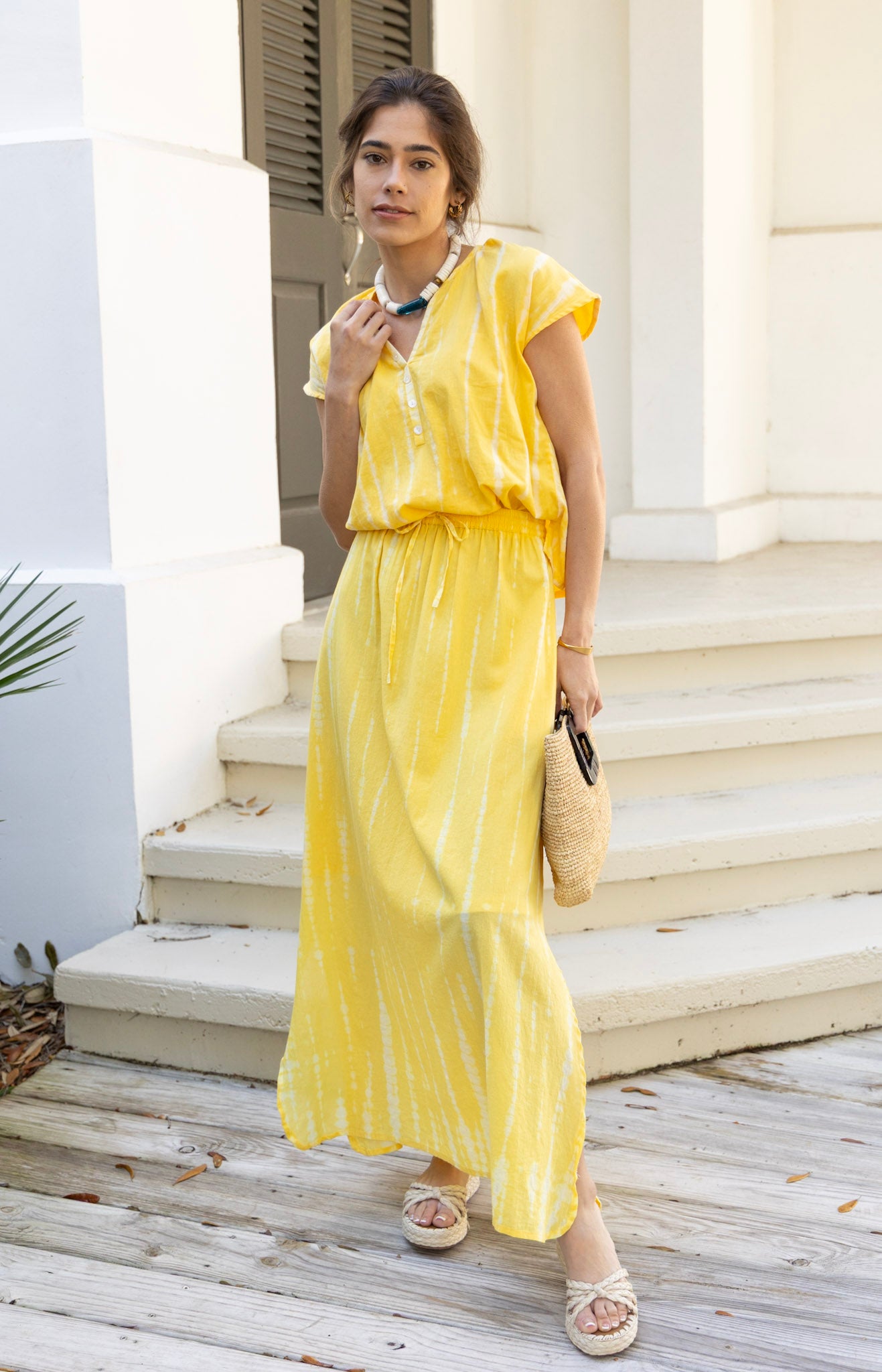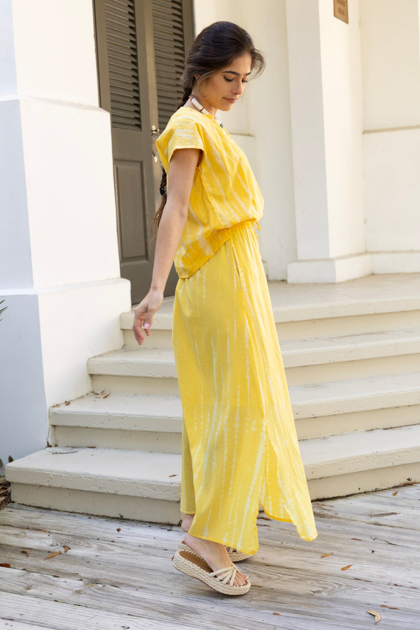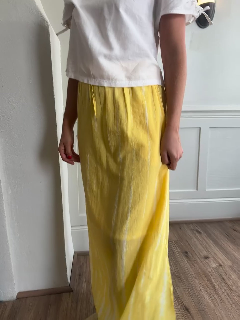 STYLE TIP: Comfortable and versatile, this maxi skirt features a yellow and white tie dye pattern with an elastic waistband, drawstring, and convenient pocket. The fully lined design and ankle-length cut with side slit offer easy movement and coverage. Perfect with a white blouse or paired with the Allie blouse in matching yellow tie dye.