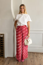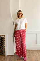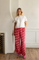 STYLE TIP: The Aiden Wide Leg Trouser is made from a silky soft crepe fabric with a hand tie dye in beautiful raspberry wine. Pair it with the matching Isla Tank Top for a coordinated set or Cam Linen Top in White for some contrast!