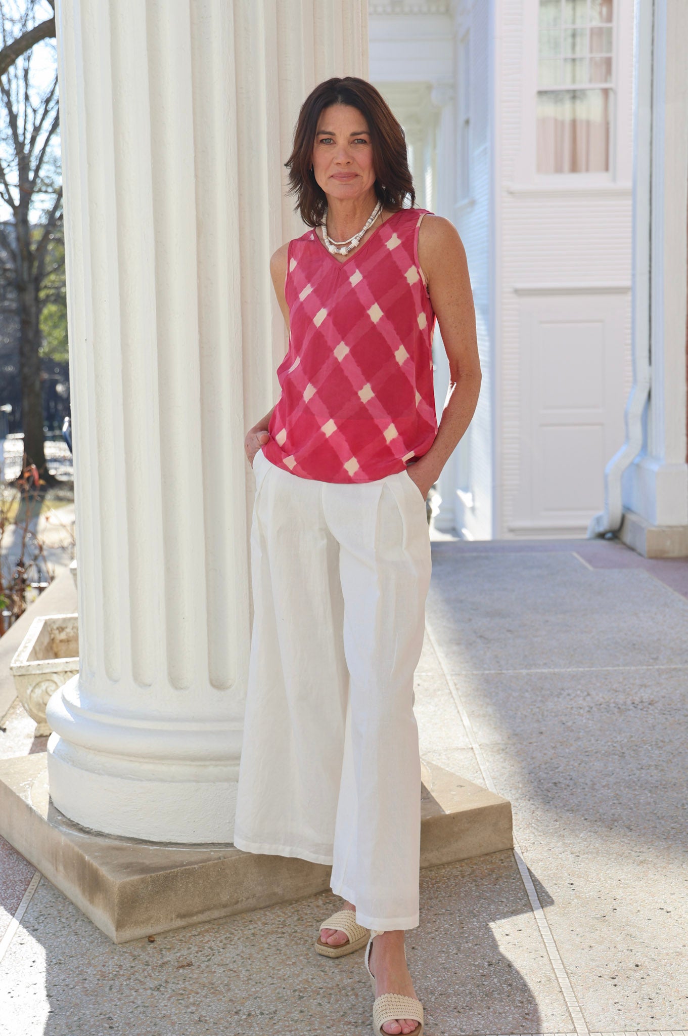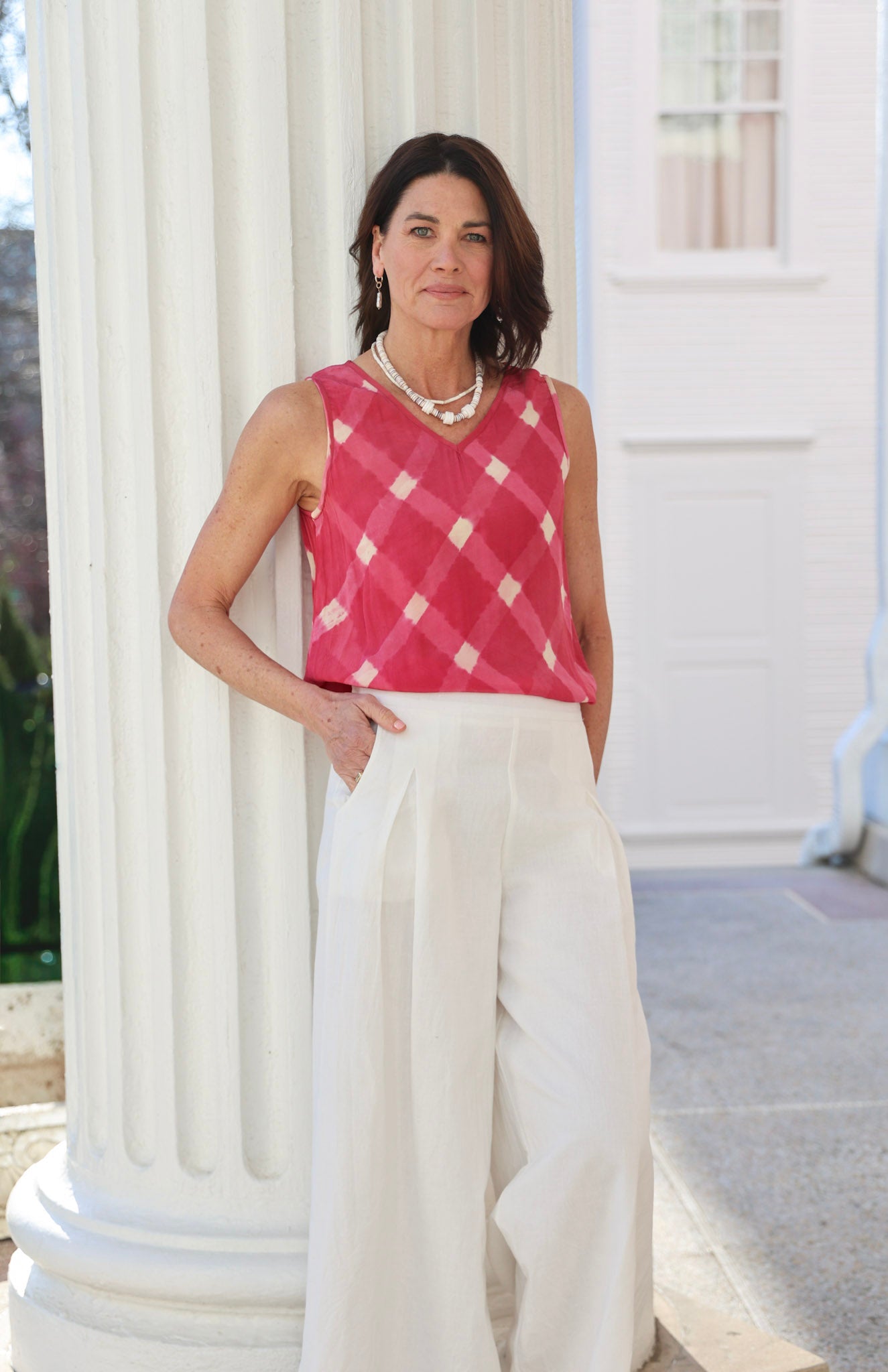 STYLE TIP: This raspberry tie-dye tank is crafted from silky, breathable crepe fabric. Hand-dyed by artisans, each Isla Tank Top is truly one-of-a-kind. Complete the look by pairing it with the Aiden pant, or create contrast with the Hayley Linen Pant in White for versatile styling options.