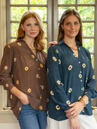 STYLE TIP: The Ari Blouse in Steel Blue Tie Dye is a soft, silky top that pairs well with light jeans or light-colored trousers. Its V neckline highlights your necklaces, making it a versatile and stylish choice for fall. Pair with the Stella Trouser in Ecru for a complete look!