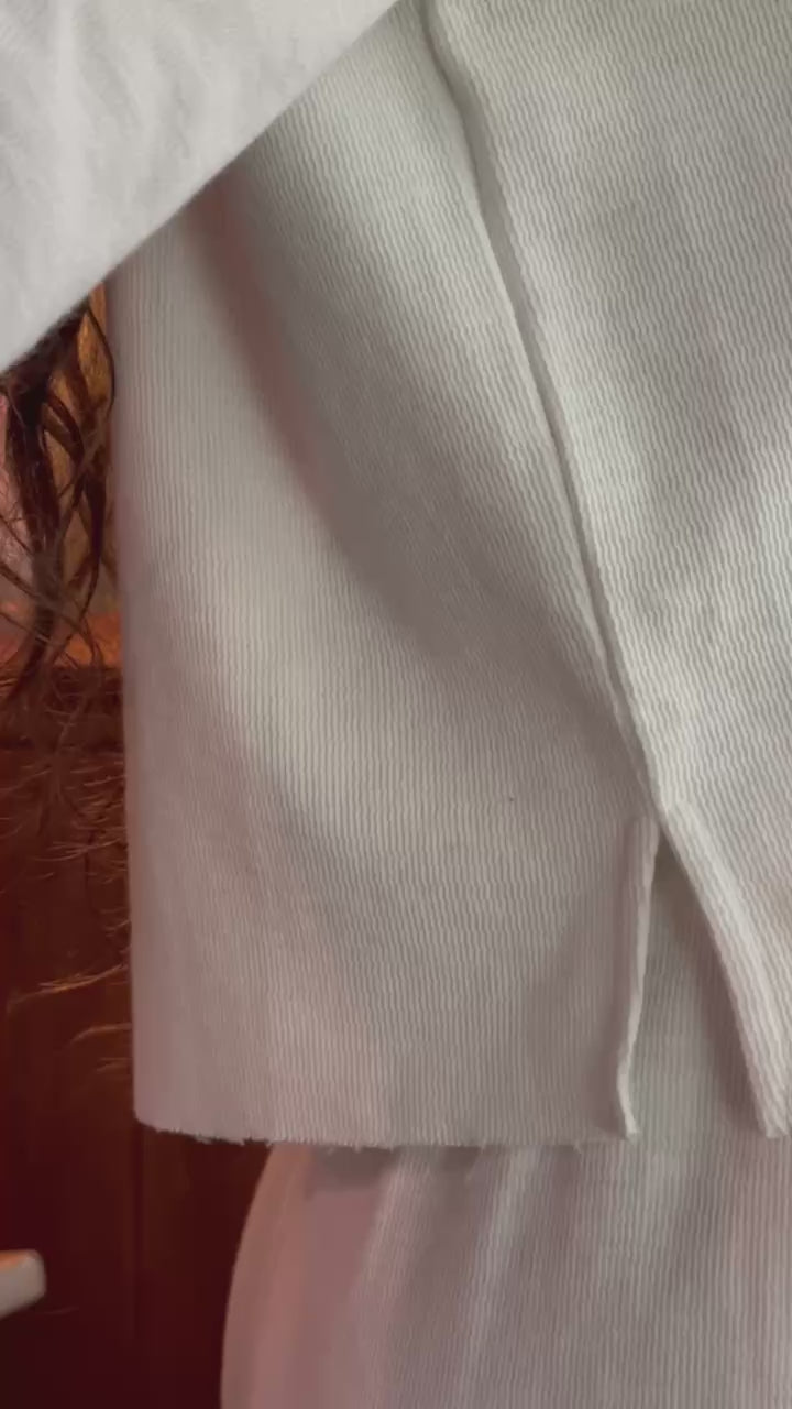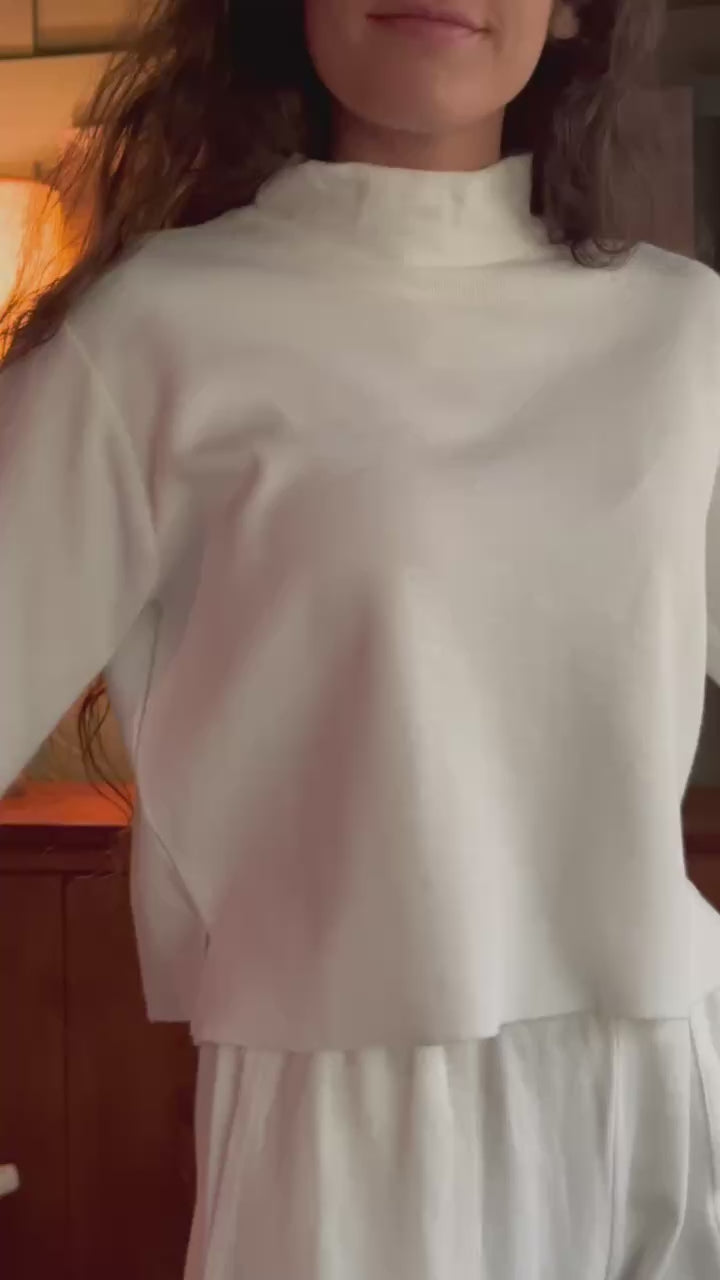 STYLE TIP: The Lola Sweatshirt in Ivory by ExVoto features a mock neck and a boxy fit, with side slits for comfortable wear. Made from soft pleated interlock reverse terry fabric, it offers a cozy and stylish look pairing with the matching Rosie Lounge Pant or back to denim!