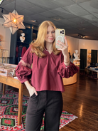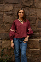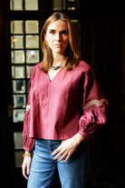 STYLE TIP: The Stella Blouse in Rosewood has a v-neck, pintuck details, and embroidered 3/4 sleeves in contrasting light pink. It falls to the hips and pairs well with high-waisted pants or jeans for a flattering look.