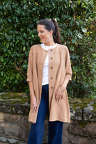 STYLE TIP: The Tia Jacket is perfect for layering over blouses and dresses, ending just above the knee. Its soft almond shade works well from Fall through Spring and pairs easily with any outfit! It features a mandarin collar, tortoise shell buttons, and handy pockets for extra charm. The 3/4 length sleeves make it easy to show off your bracelets.
