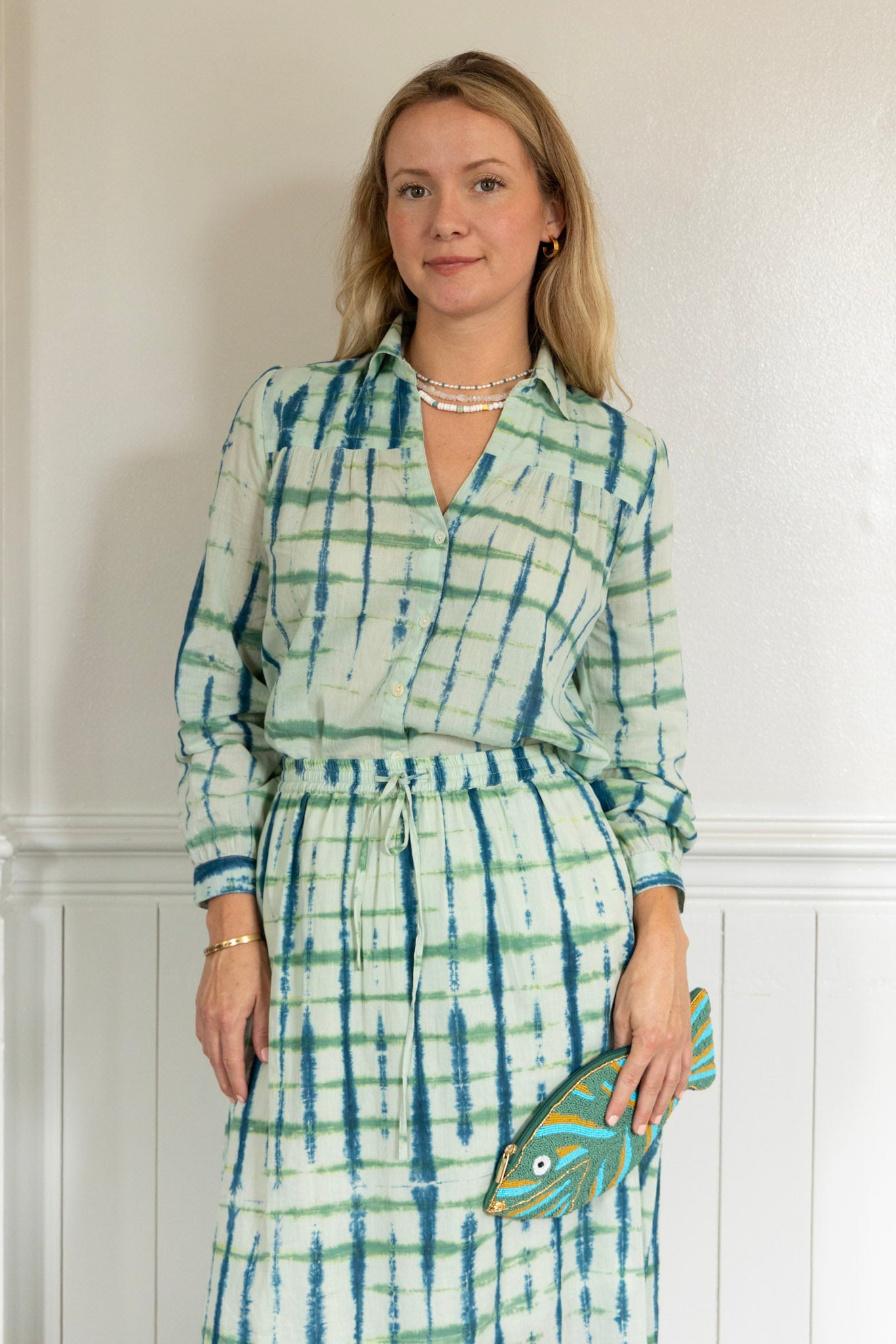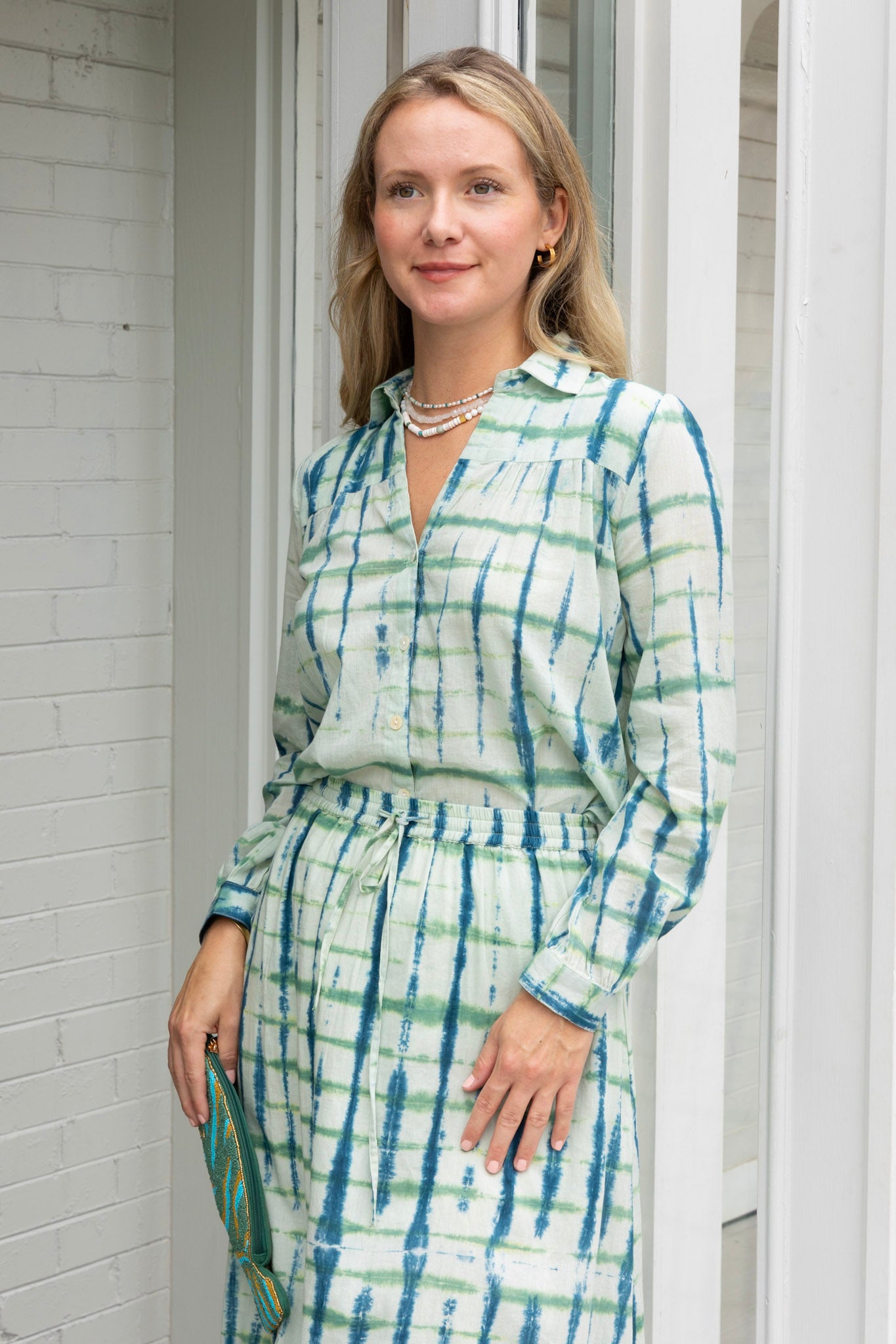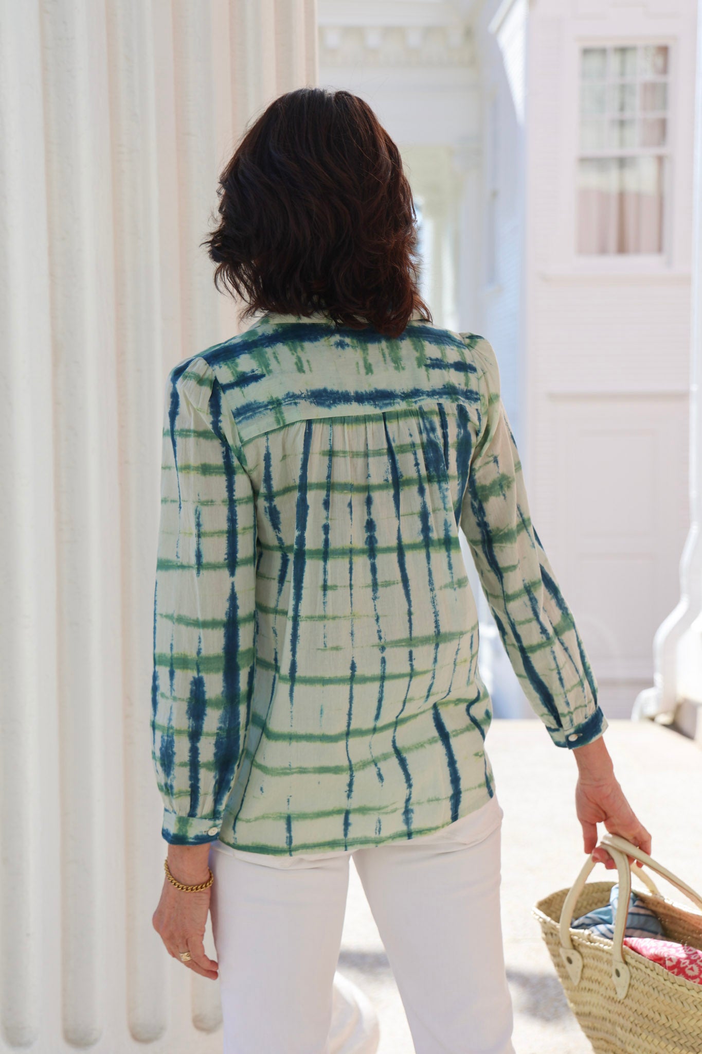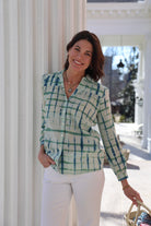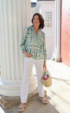 STYLE TIP: The Ari Tie Dye Blouse is light and airy without being sheer and features a shell button front and collar neckline. Pairs with the Aiden Shorts & Skirt or style it back to blue or white jeans. Tie it up in the front and wear it with the Hayley Trouser in white or navy!