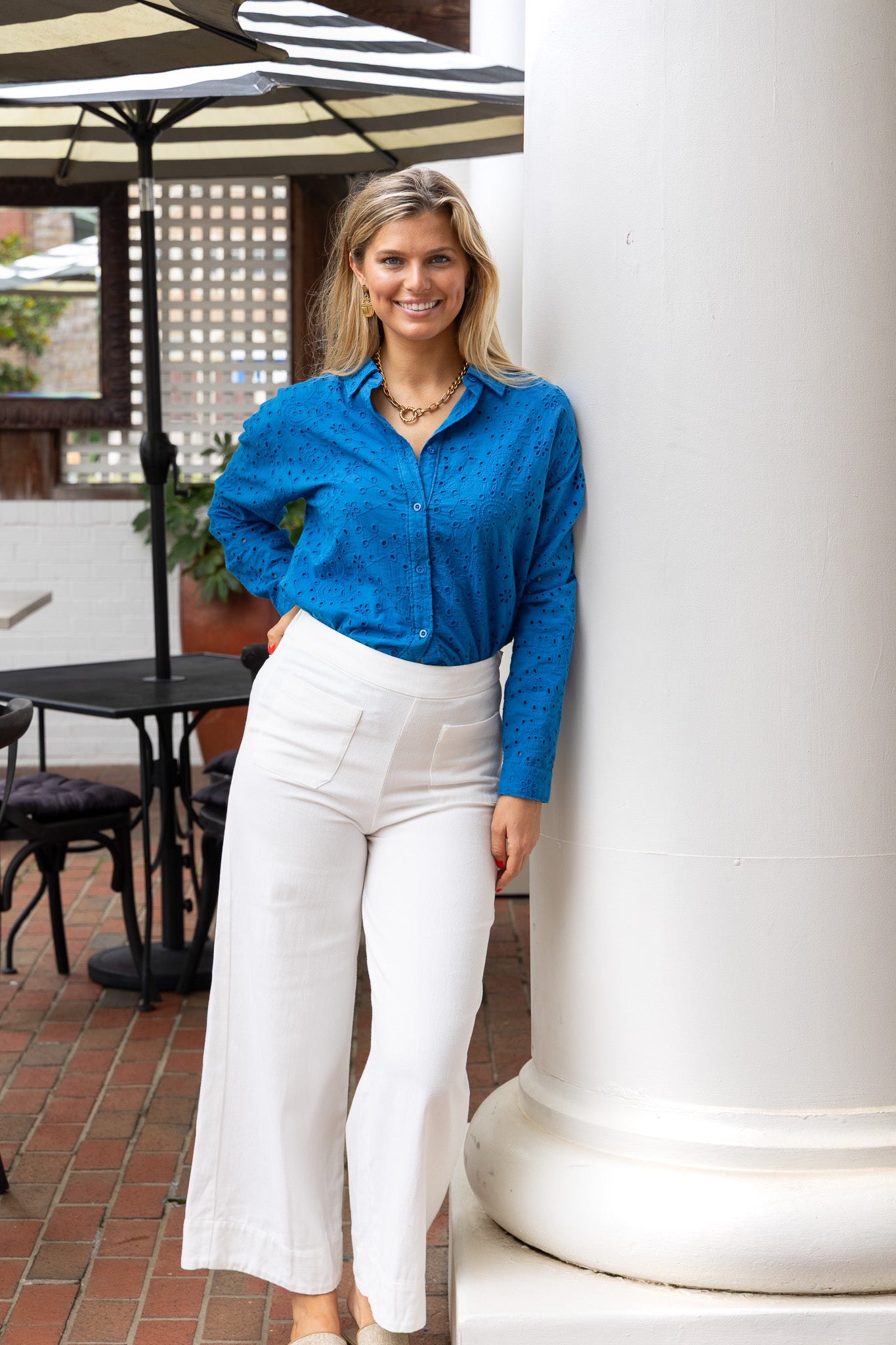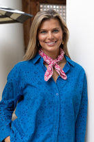 STYLE TIP: Crafted from cotton, this eyelet blouse features a lined bodice with breathable unlined sleeves for all-day comfort. The cobalt blue hue pairs beautifully with our Stella Trouser in Ecru or the coordinating Daphne Shorts for a polished monochromatic ensemble.