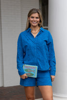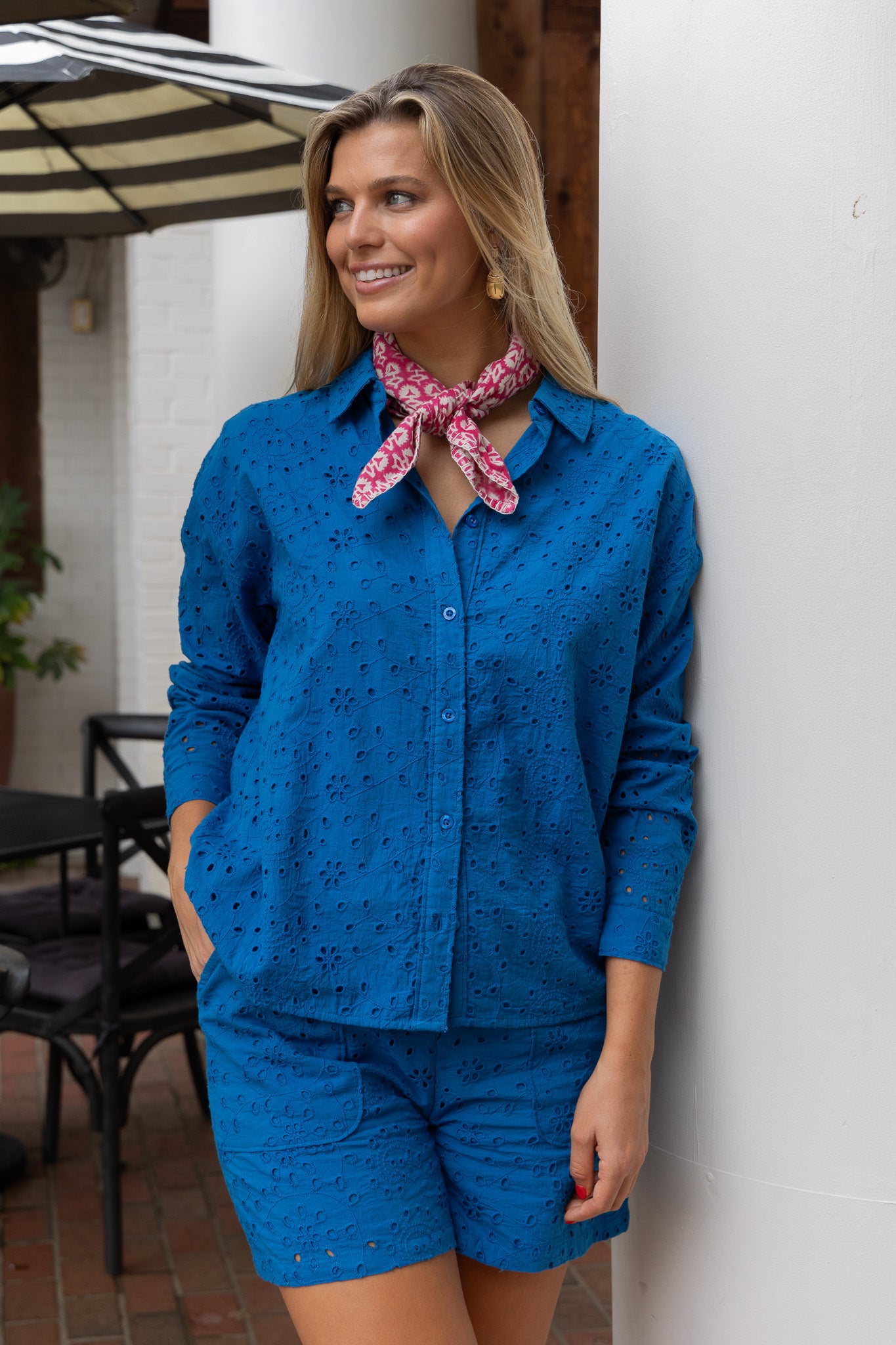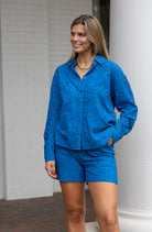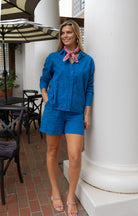 STYLE TIP: The Daphne Eyelet Shorts in a beautiful cobalt blue cotton with a high waist and modest length. Perfect paired with the coordinating Daphne Blouse or White Leslie Blouse for a complete look.