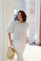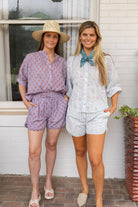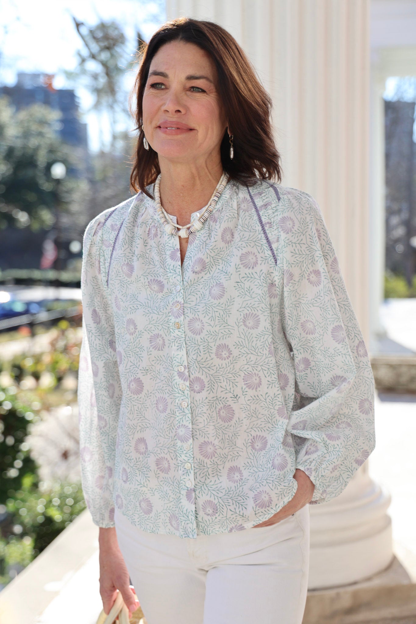 STYLE TIP: Crafted from crisp cotton, this blouse showcases a striking lavender and mineral blue blockprint design. Long sleeves with elastic wrists let you adjust the fit effortlessly—roll them up for warm weather or keep them down for cooler days. The timeless pattern and neutral base make it easy to style year-round, whether you're pairing it with summer shorts or layering it under a jacket.