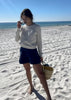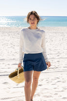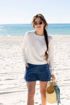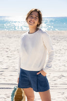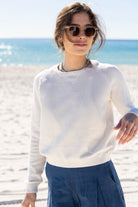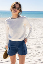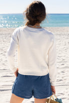 STYLE TIP: The perfect pullover knit sweater for those chilly Spring days in a crisp clean white. Pack this sweater for your spring break trip whether you are going to the mountains or the beach!